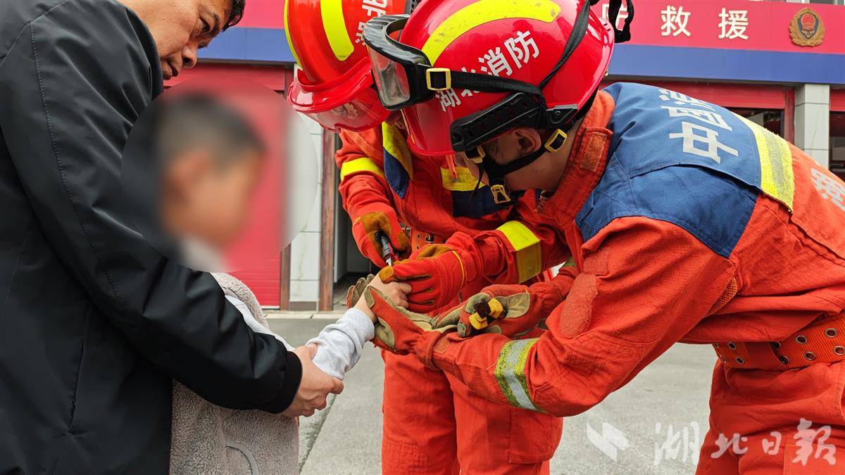 湖北日报讯(记者童晨曦、通讯员李静书、何万思)“我们有一名学生手指被卡在雨伞伞环里了,能帮忙取出来吗?”4月13日8时14分,咸宁市赤壁市金鸡山路政府专职消防救援站接到求助:辖区某小学一名二年级男孩因贪玩,将手指塞入雨伞伞环中无法取出。老师随即驾车将学生送往消防站处置。