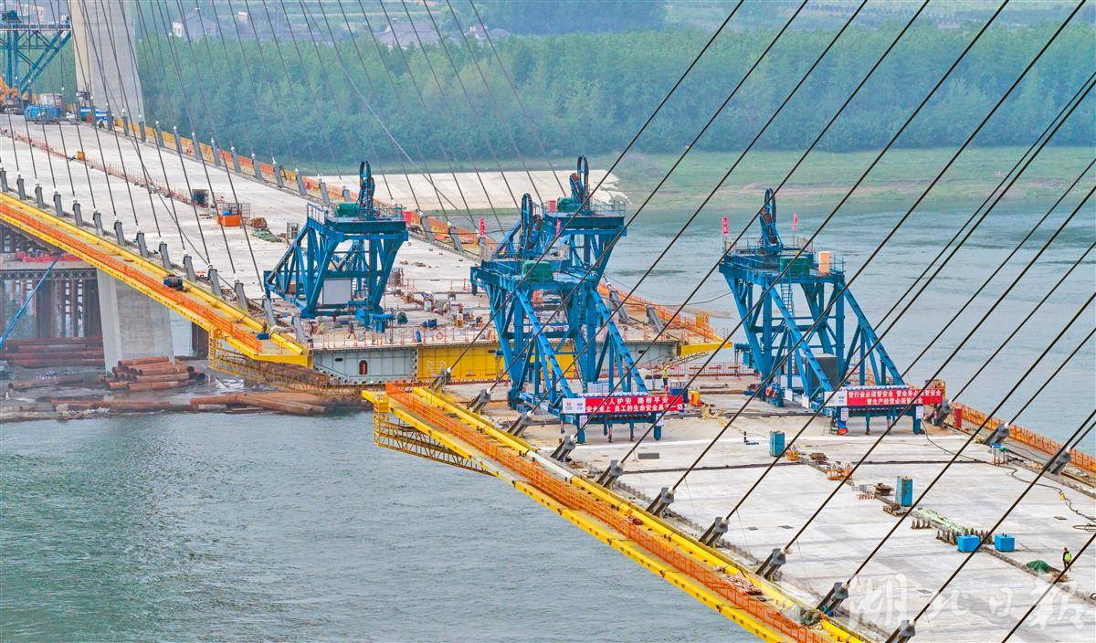 目前,大桥北岸29对斜拉索及配套钢箱梁已全部安装完成,北岸工程全面转入桥面精细化施工阶段。待南岸主塔完成最后3块钢箱梁吊装,大桥将正式进入关键合龙工序。