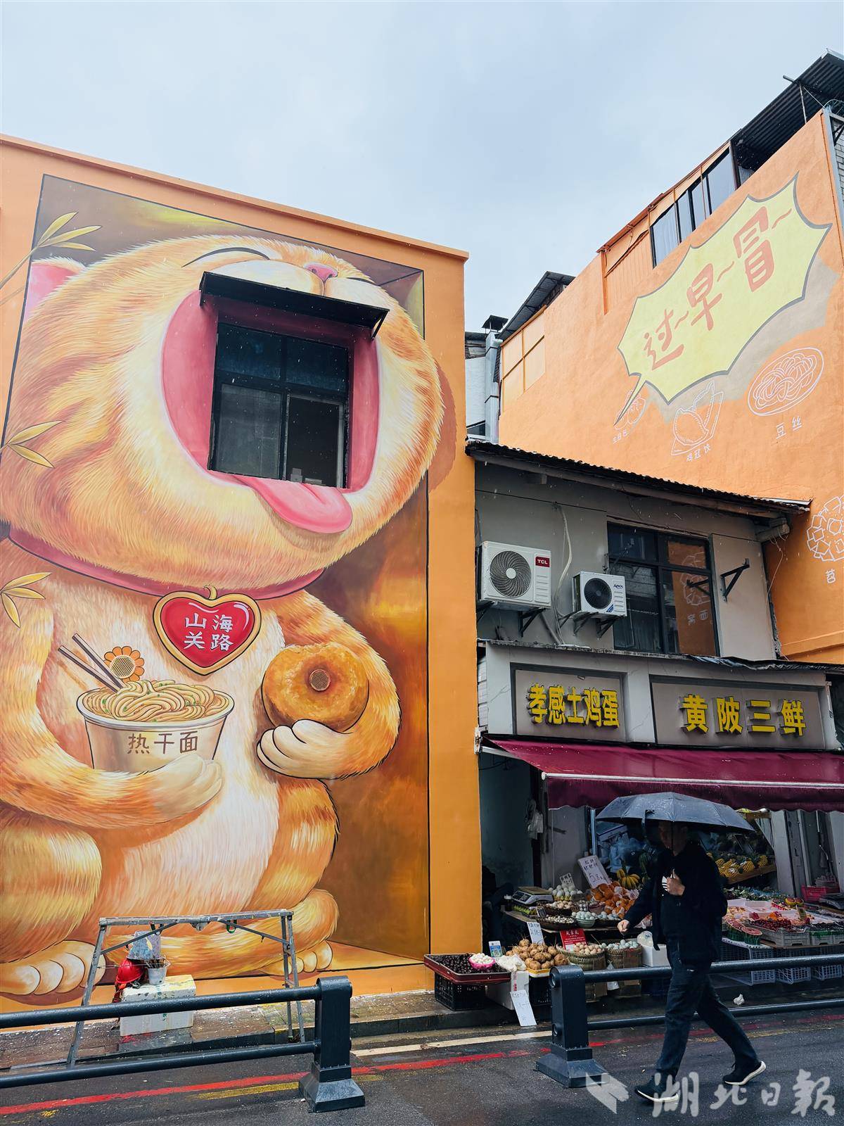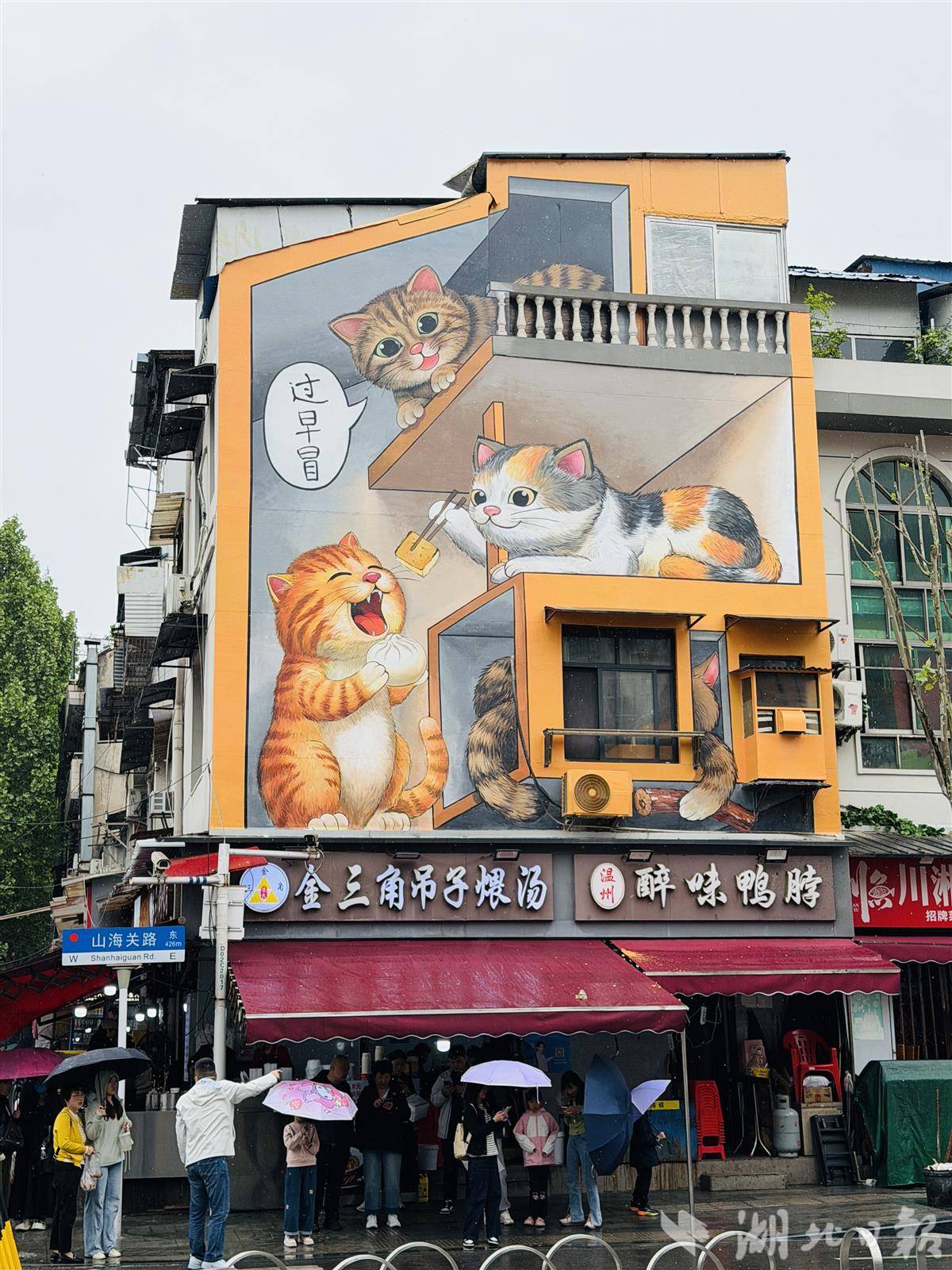 4月14日,武汉“过早”热门地山海关路惊喜变身!几只巨大可爱的“过早猫”悄然跃上老房墙壁,接近完工。“过早猫”与武汉话“过早冇”谐音,将地道市井烟火与萌趣涂鸦巧妙碰撞,市民街坊和游客纷纷驻足合影。当热干面的香气遇见墙上的喵星人,山海关路的清晨,正被创意与活力点亮。