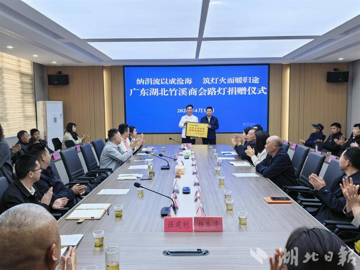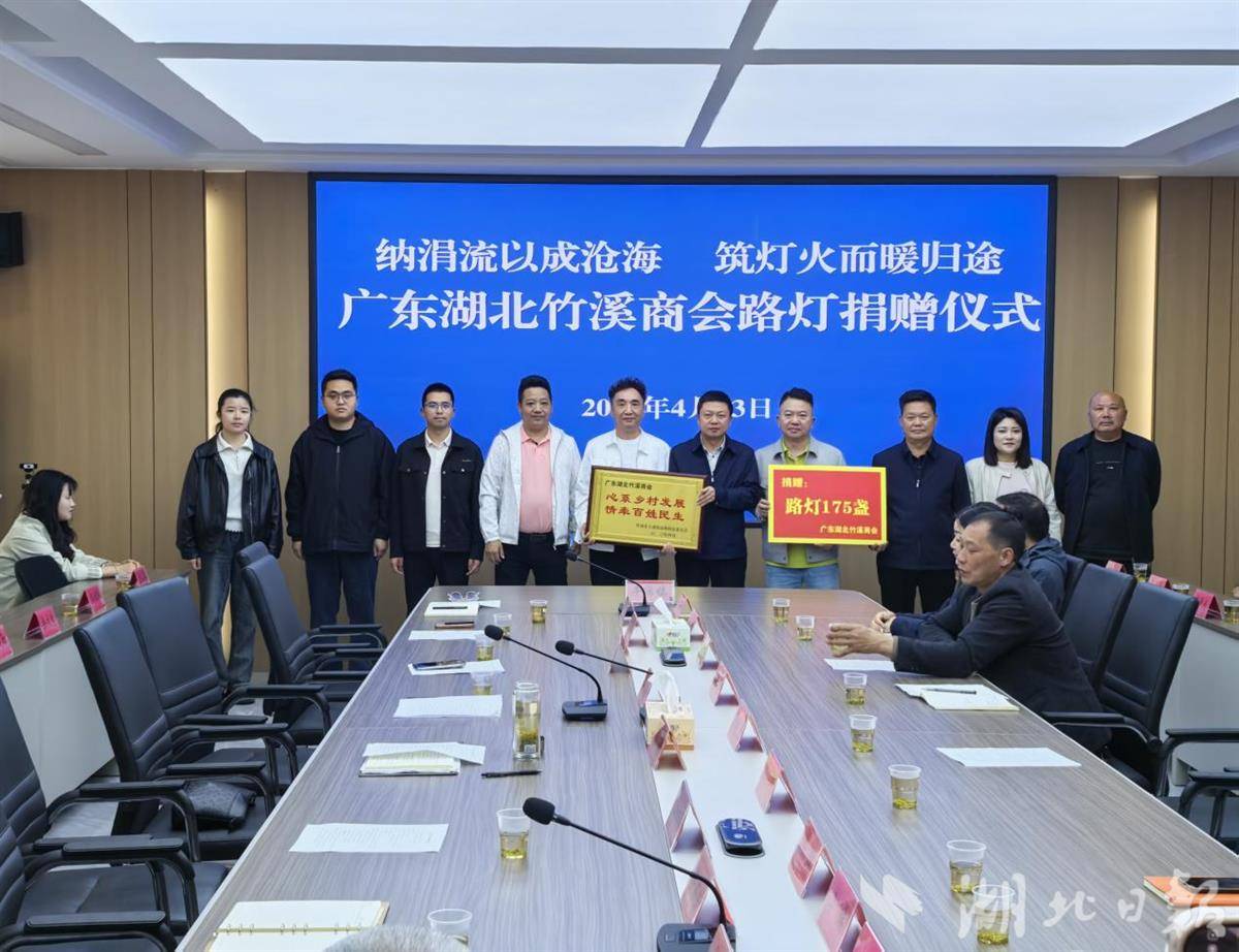 湖北日报讯(通讯员陈建树、孙立军)4月13日,竹溪县丰溪镇政府院内暖意融融,广东竹溪商会路灯捐赠仪式在此顺利举行。会长张志军、副会长王海及理事曾祥海一行3人回到故乡,向凉桥村、丰溪村捐赠175盏路灯,总价值20余万元。受赠村党员、群众代表近50人见证了这一温暖时刻。