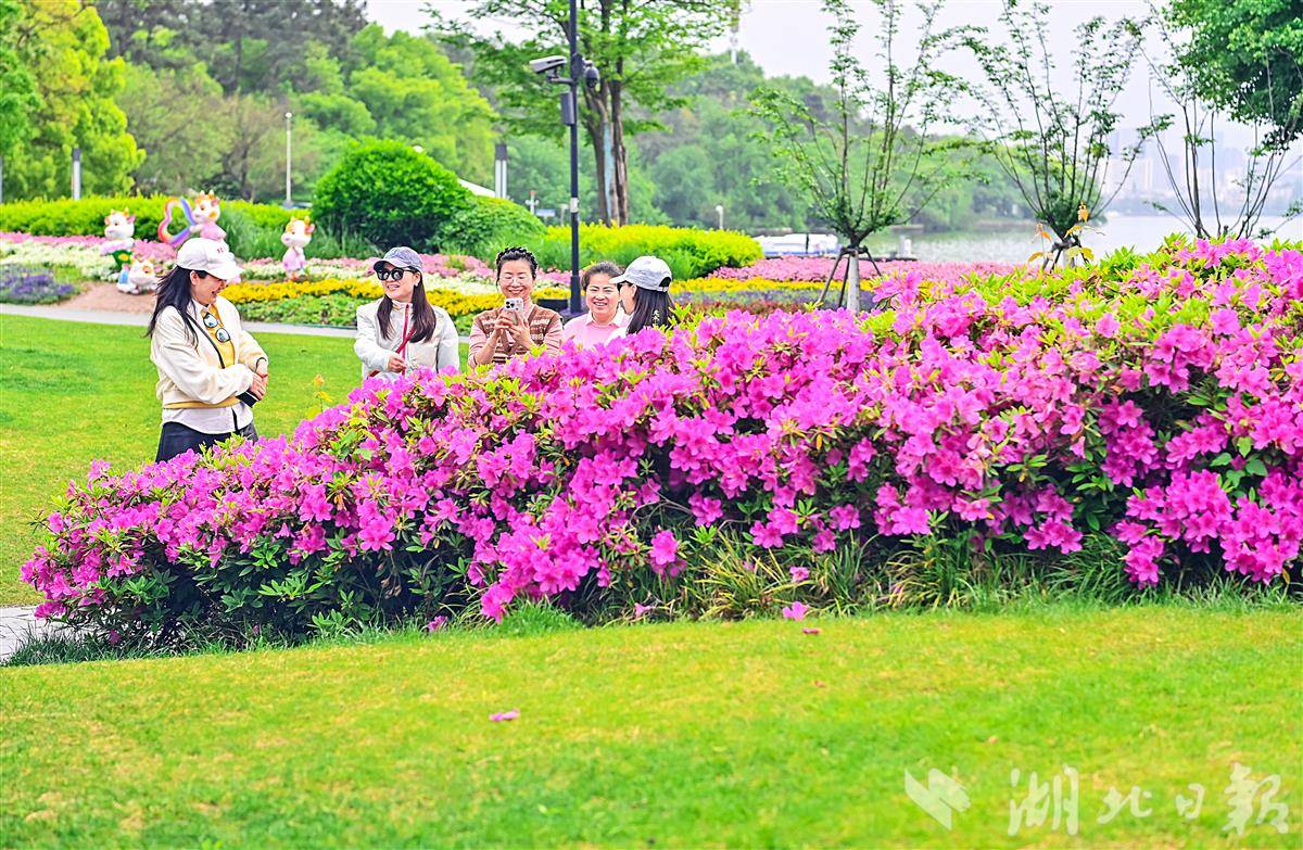 4月14日,武汉东湖磨山脚下的绿道旁杜鹃花现已竞相开放。