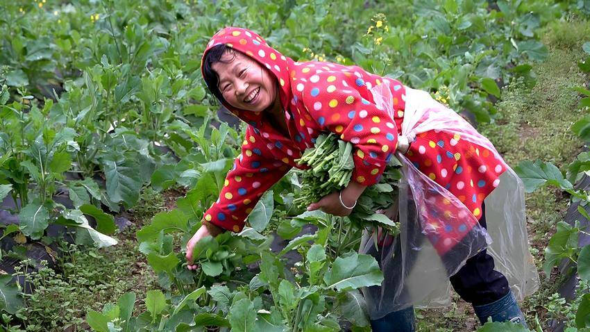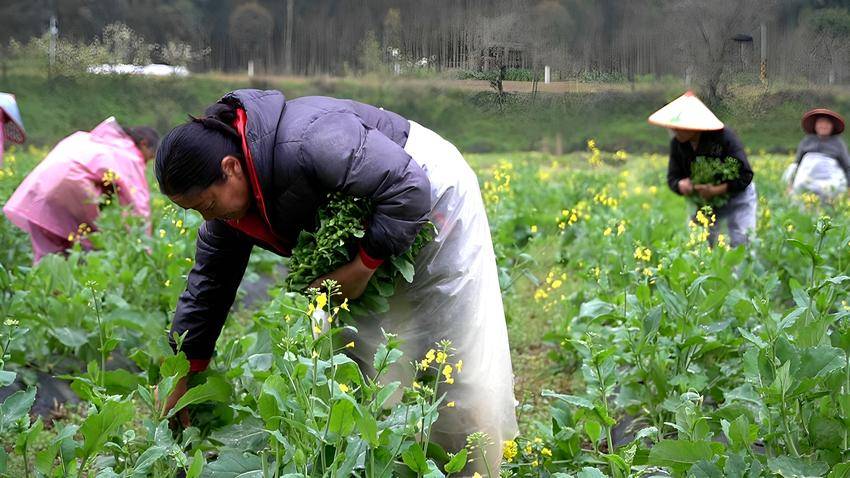 下午4点,在鹤峰县太平镇奇峰关村,连片的500亩蔬菜基地在春雨的浸润下显得格外翠绿。虽然天空不作美,但村民们采收的热情丝毫未减。大家穿着各色雨衣,手法娴熟地将一根根粗壮的硒油菜薹摘下,整齐码放在田边的转运筐内。