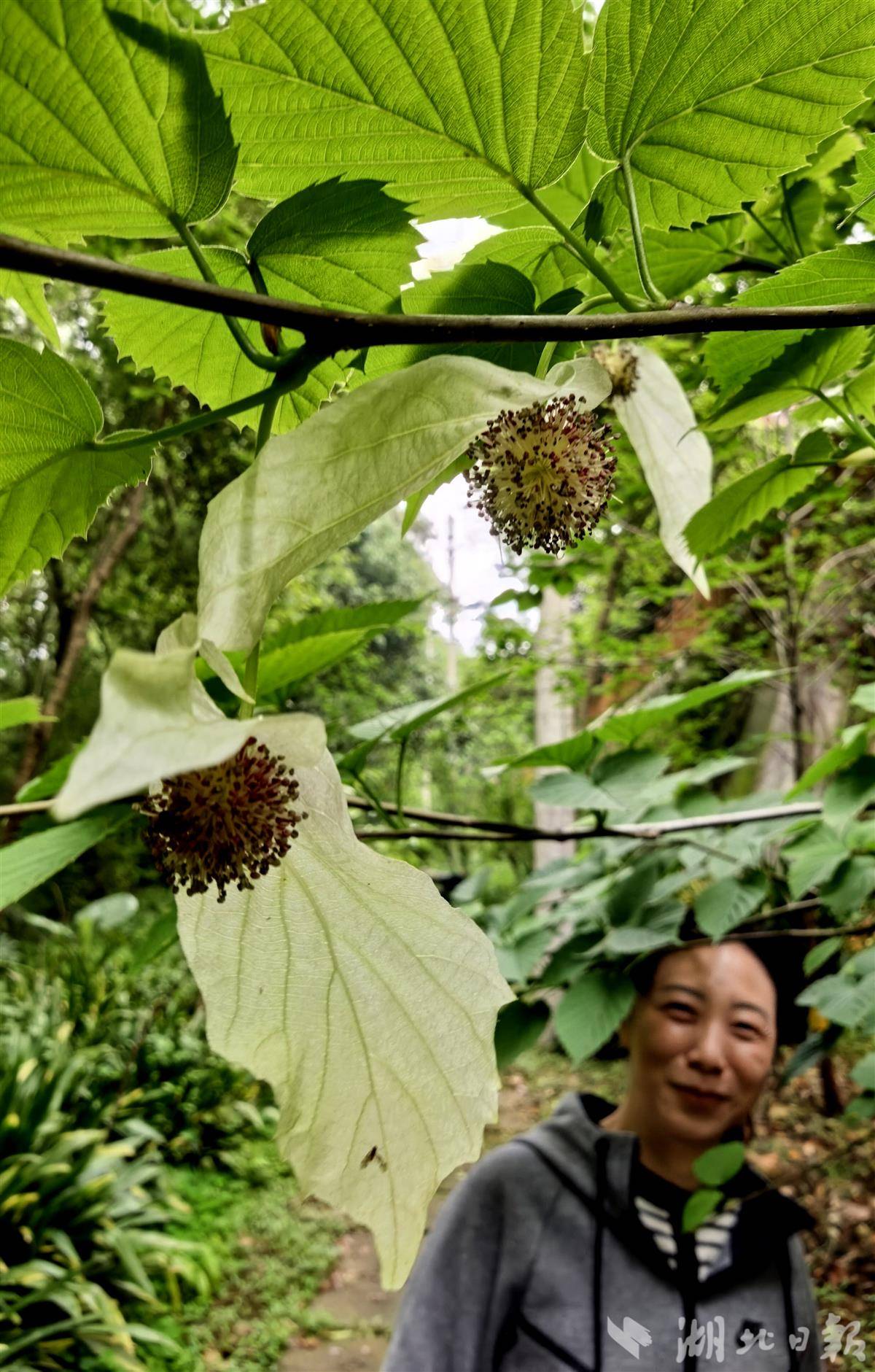 据悉,此次开花的珙桐由宜昌市园林绿化植物研究所于2019年从长阳引种。科研人员历经多年系统培育,通过科学引种、适应性驯化等技术手段,成功攻克低海拔环境适配难题,让珙桐在城区稳定生长并顺利开花。