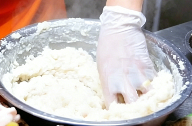 他将肉团反复捧起、摔下、搅拌