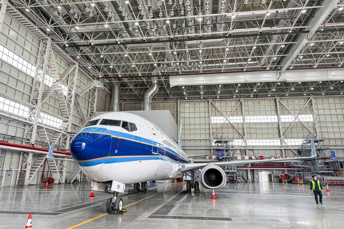走进机库,最直观的感受就是“大”。机库总建筑面积超过1.2万平方米,跨度90米、进深80米,可同时为两架窄体机实施喷漆作业,也可容纳一架宽体机入库作业。
