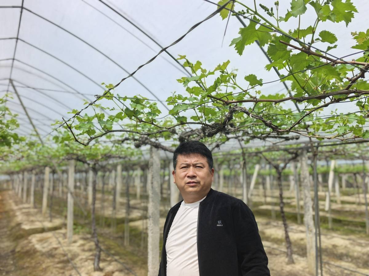 棚内,葡萄藤蔓葱郁。这片200多亩种植基地的主人黄铁强,操着浙江口音的普通话,正指导工人整枝管护。