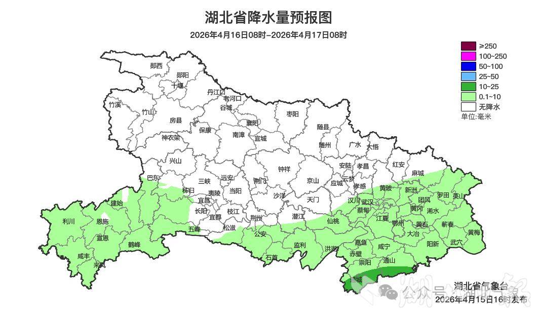 15日,湖北短暂放晴后,下午南部地区再度被阴云覆盖。截至15时,恩施、荆州、咸宁等地出现分散性小雨,白天大部地区最高气温在18至22℃之间。预计15日晚到16日白天,南部和东部地区仍有弱降雨,其他地区以多云到阴天为主。16日夜间起,省内大部地区雨水退散,转为多云到晴。接下来一直到19日(周日)白天,全省都将维持晴朗升温的天气格局,各地气温逐日攀升,向30℃迈进。