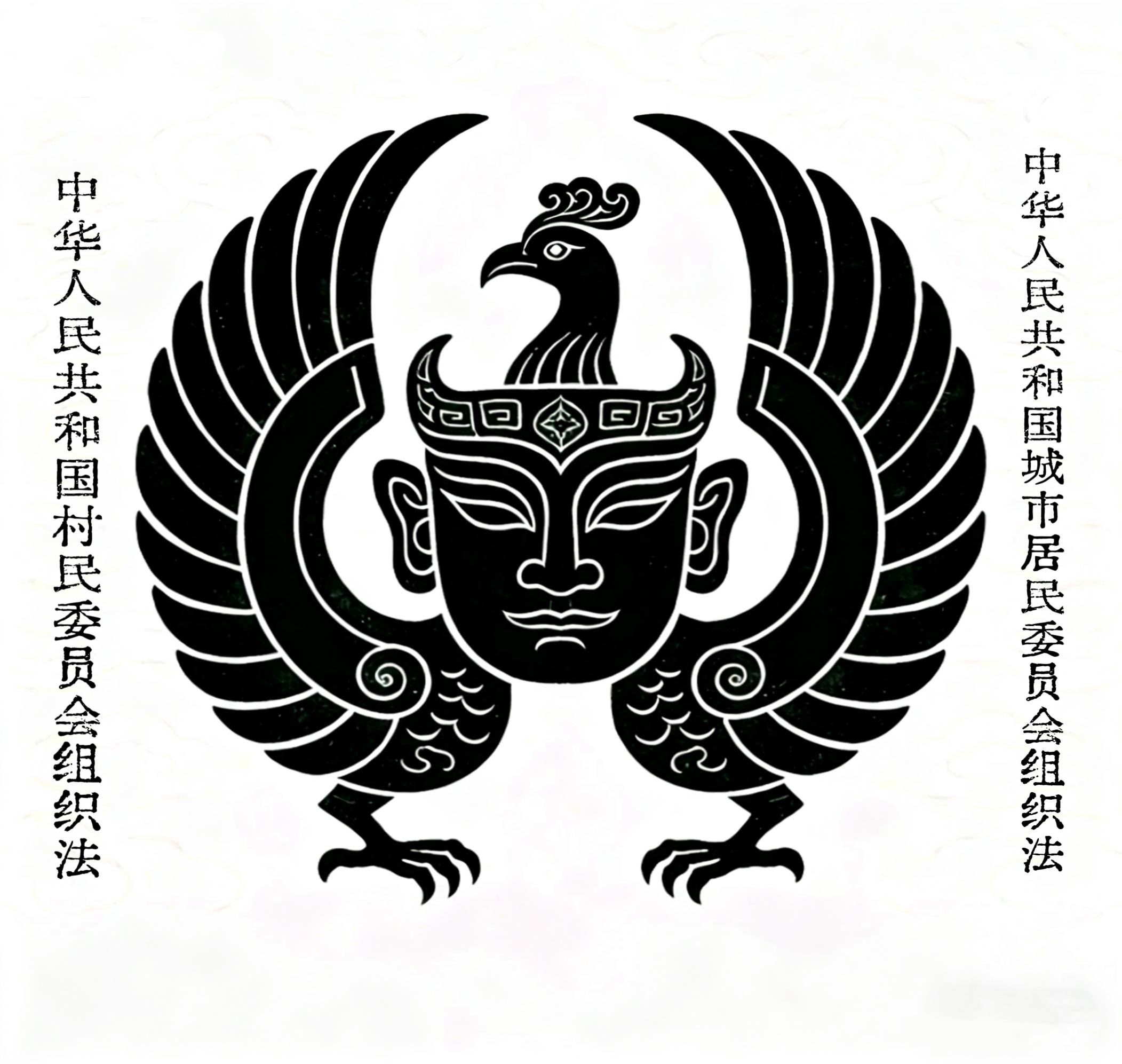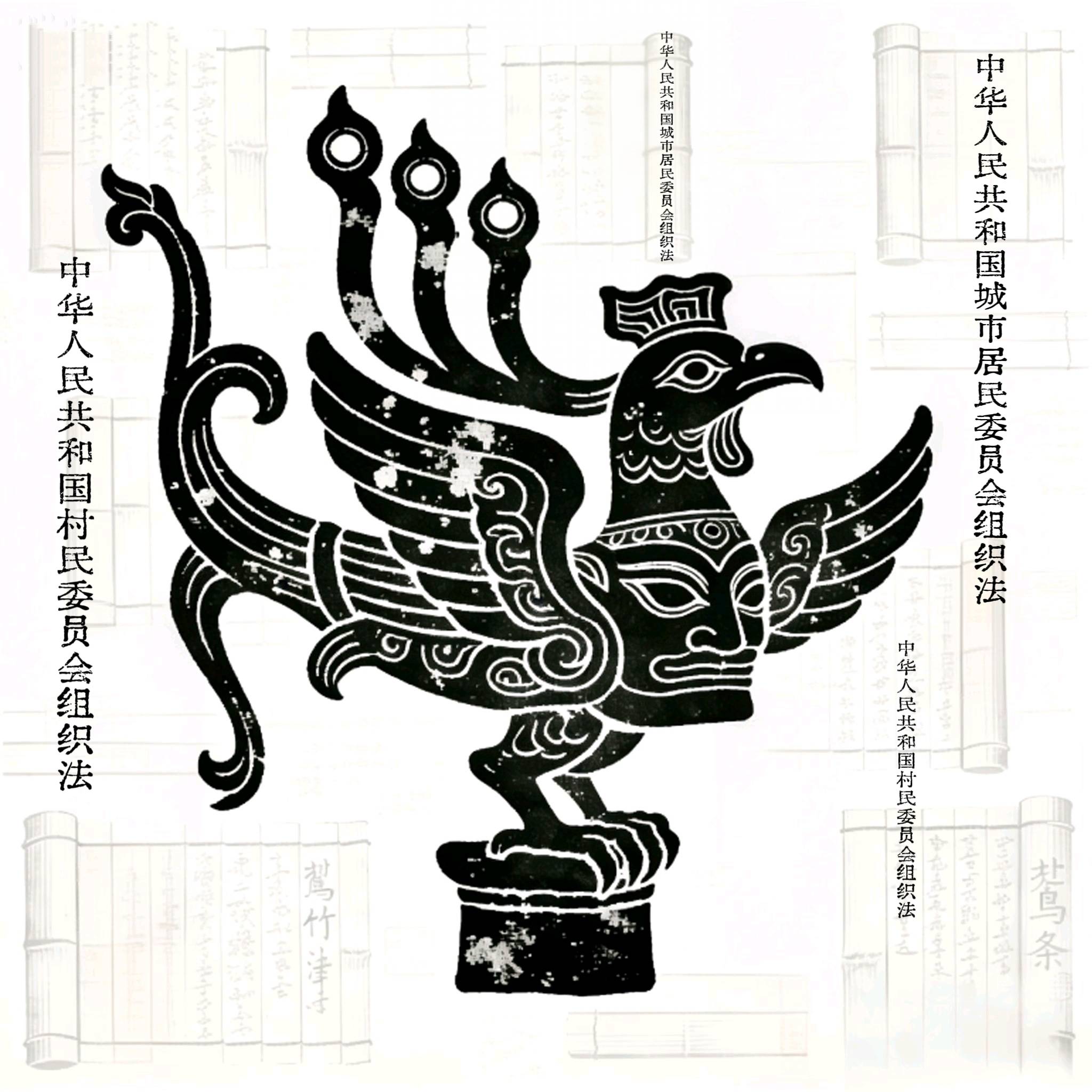 作品简介:以荆楚文化标志性图腾“凤鸟人面”为核心视觉符号,采用庄重对称的黑白构图,搭配云纹背景烘托传统气韵。画面将楚文化中象征公正与守护的凤鸟意象,与《中华人民共和国村民委员会组织法》《中华人民共和国城市居民委员会组织法》的普法主题深度融合,寓意以法治精神守护基层民主秩序,让法律意识在传统文化浸润中深入人心。