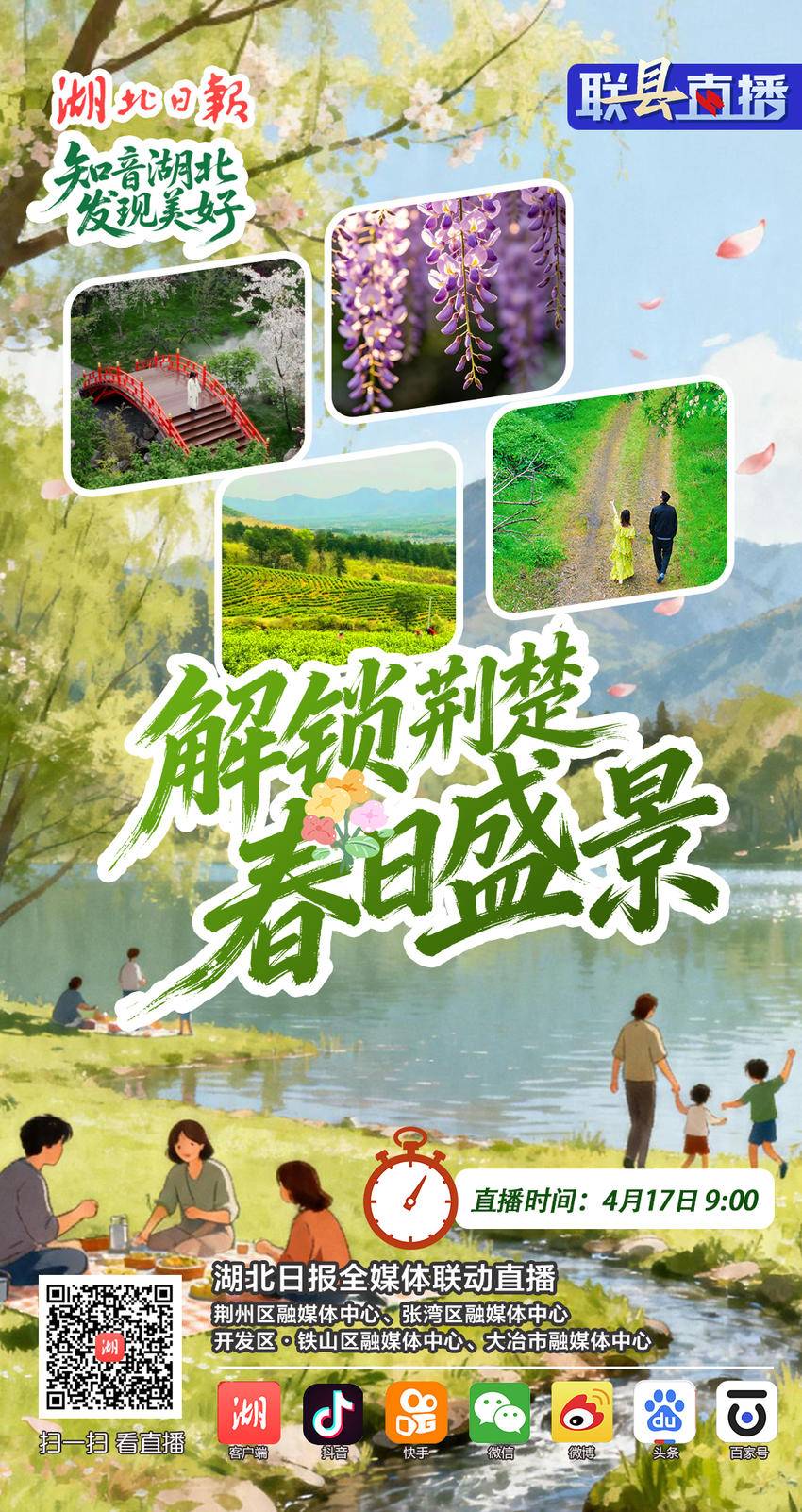 4月17日上午9时,湖北日报联动荆州区、张湾区、开发区・铁山区、大冶市融媒体中心,开启一场沉浸式直播,一键解锁湖北春日画卷。