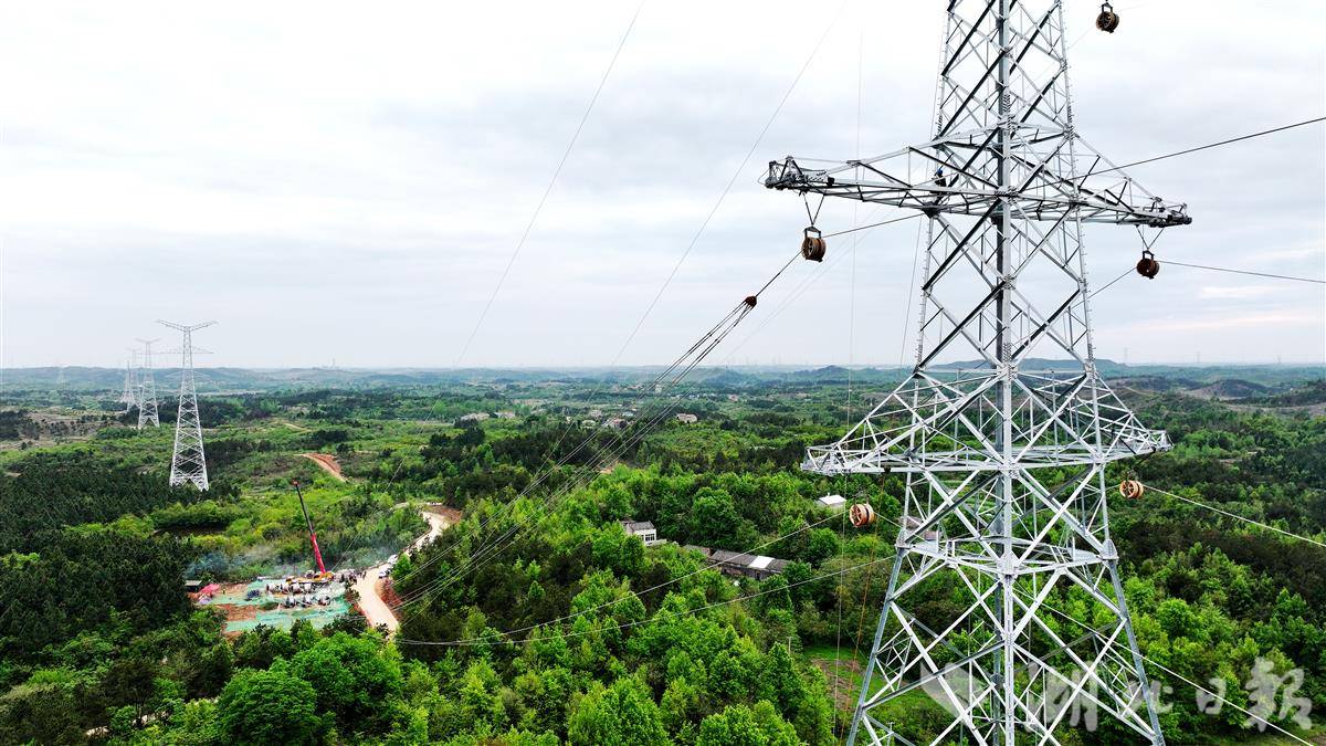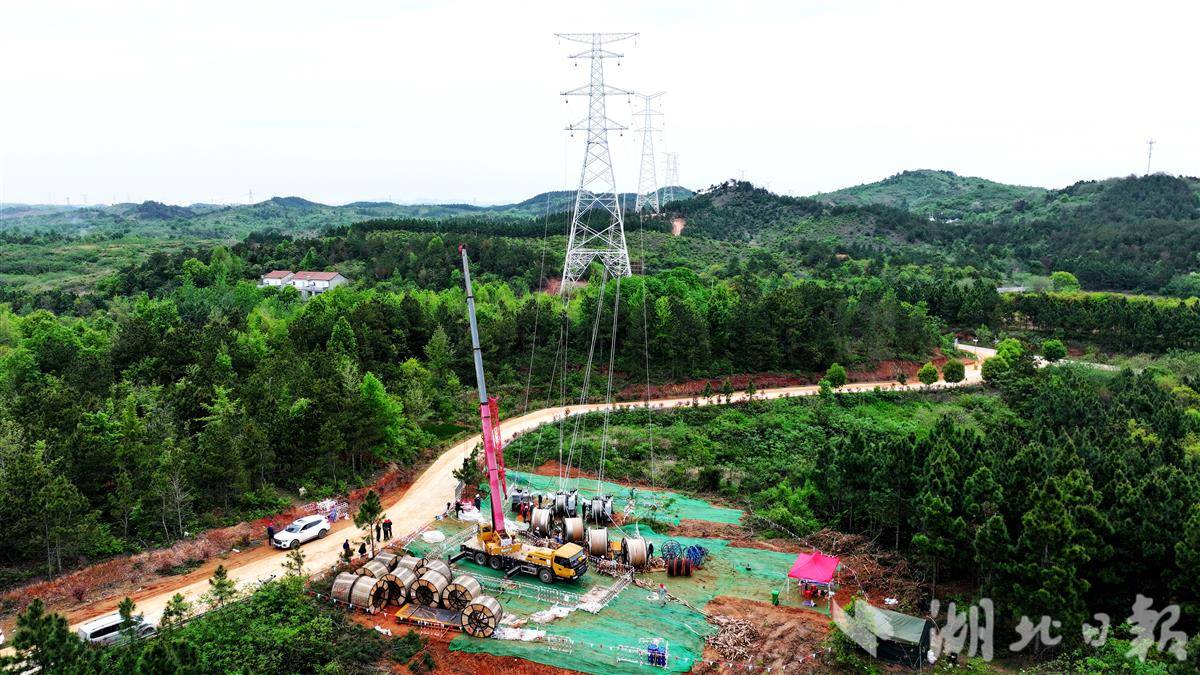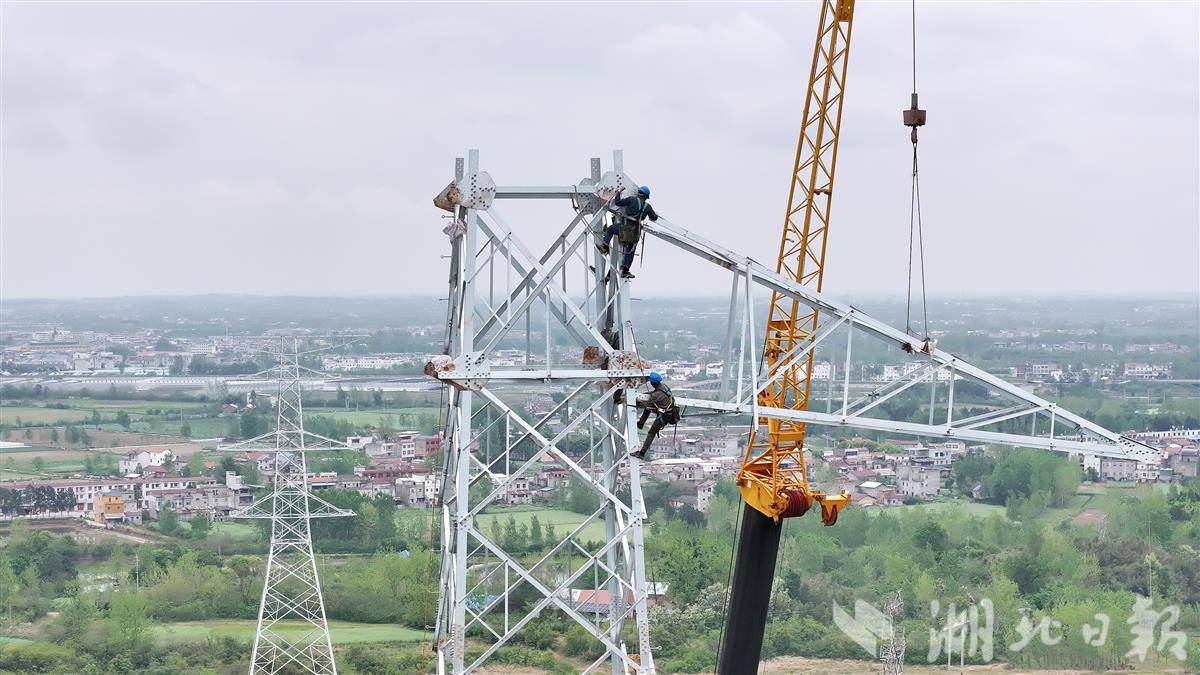 国网湖北送变电公司20个作业班组、600多名施工人员立塔与架线多工序并行施工,快速推进工程建设