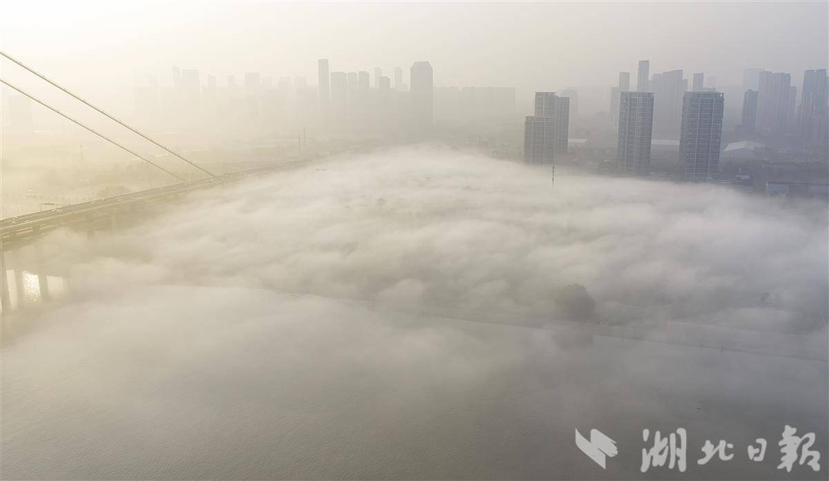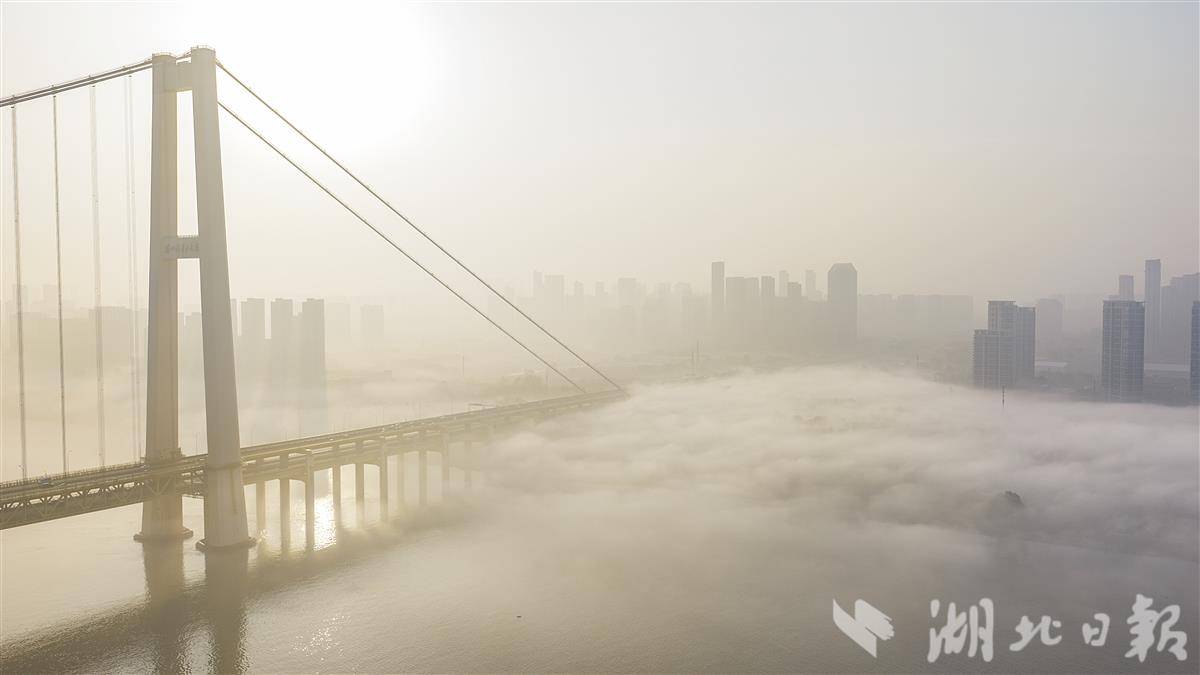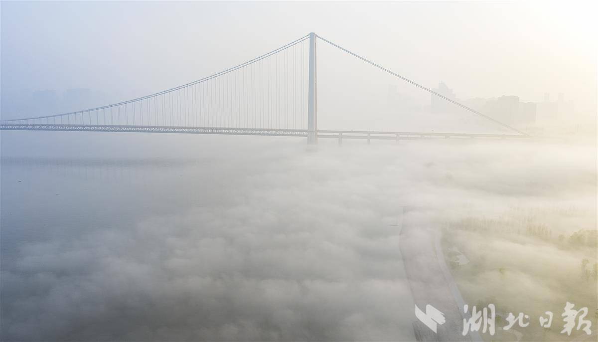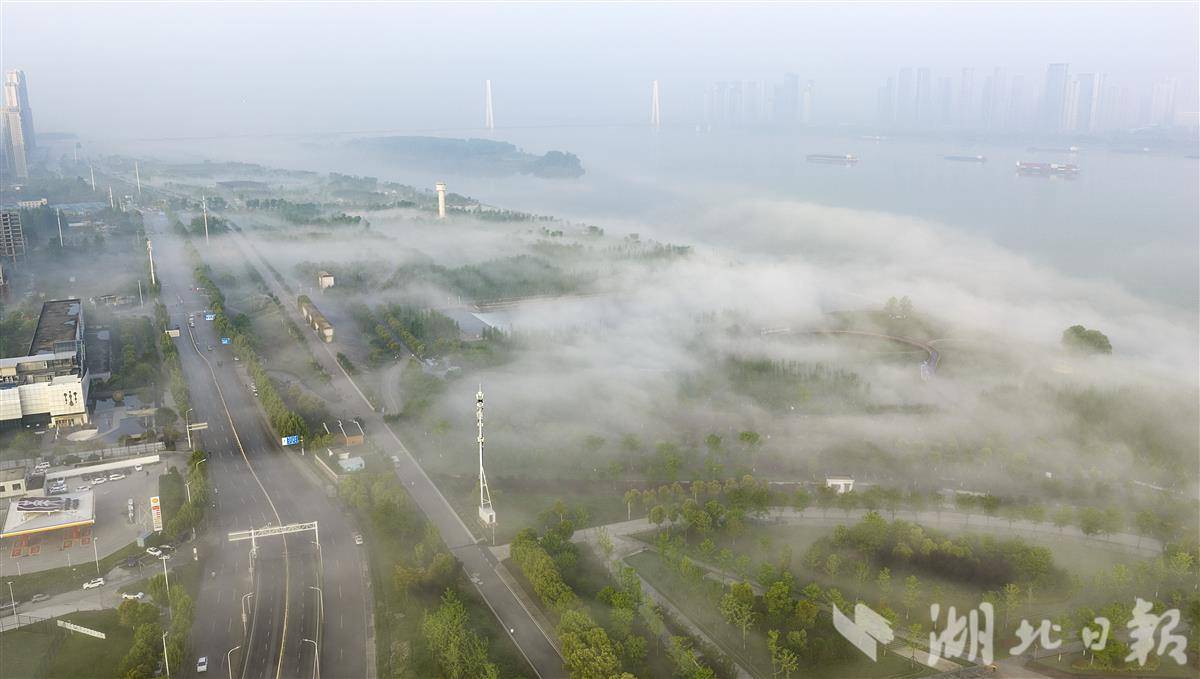 4月17日,武汉市遭遇大雾天气。洪山江滩和杨泗港长江大桥在雾气腾腾中若隐若现。