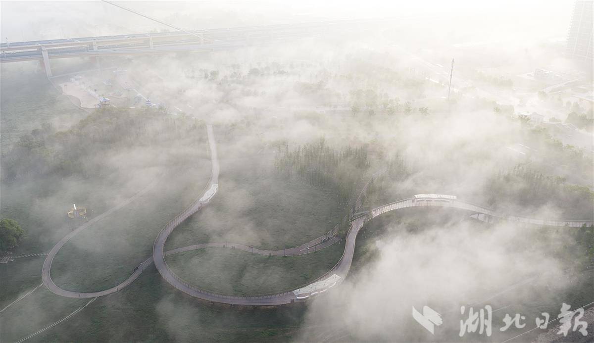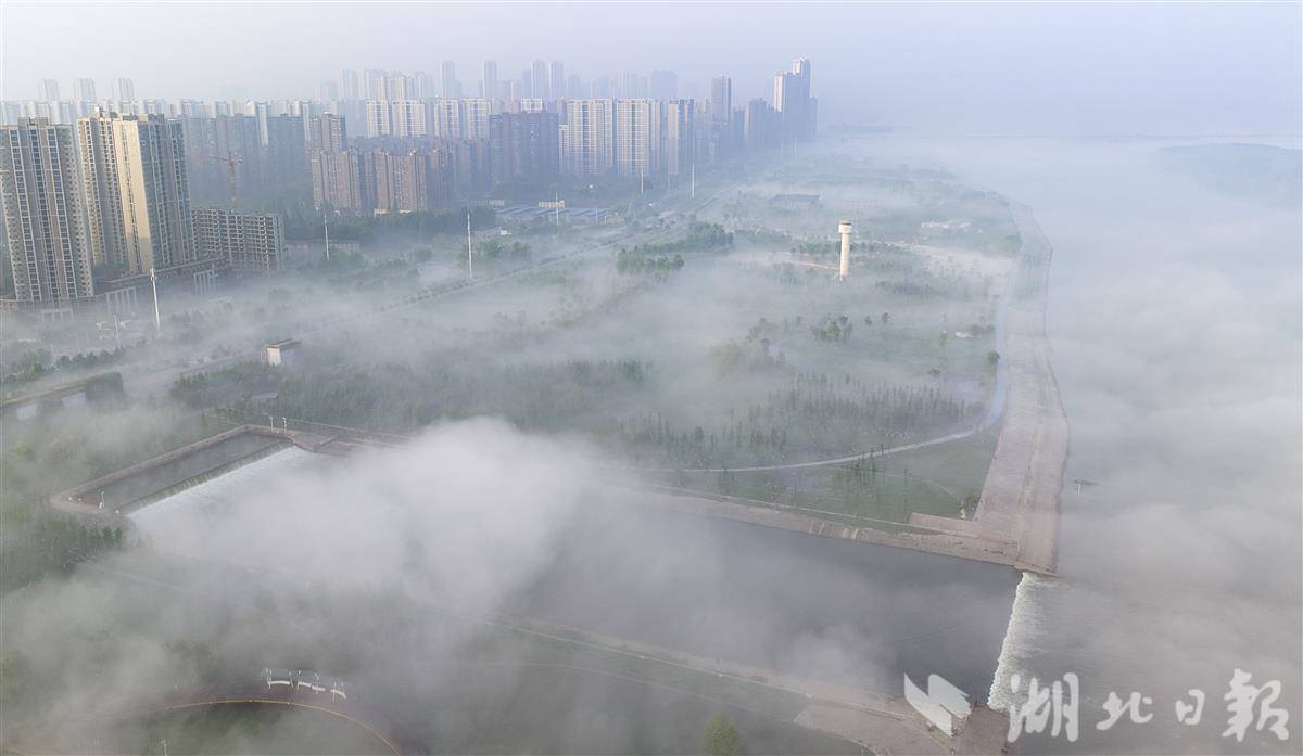 4月17日,武汉市遭遇大雾天气。洪山江滩在雾气腾腾中若隐若现。