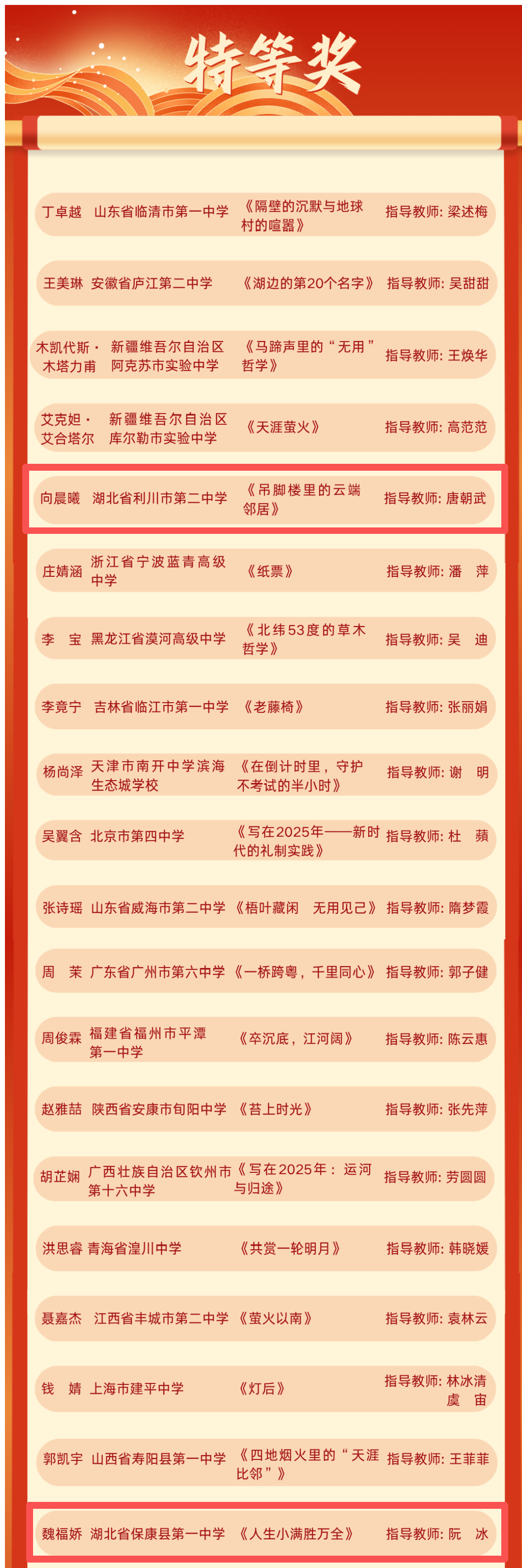 湖北日报讯(通讯员江海)近日,第二十六届世界华人学生作文大赛获奖名单正式公布。在中国侨联指导下,湖北省侨联周密部署、广泛发动,我省利川市第二中学向晨曦(作品《吊脚楼里的云端邻居》,指导老师:唐朝武)、保康县第一中学魏福娇(作品《人生小满胜万全》,指导老师:阮冰)2名同学荣获国内组特等奖,获特等奖人数与山东、新疆并列,居全国首位。