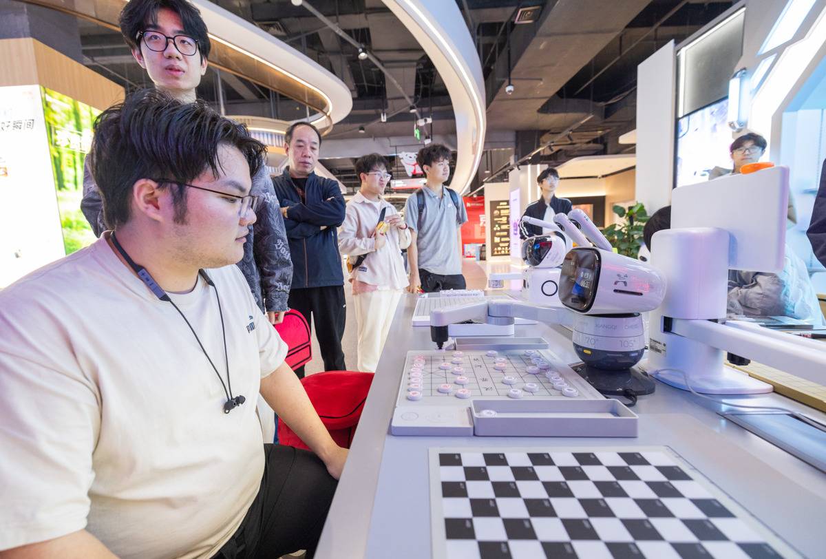 4月17日,顾客体验和机器人棋手对弈。(湖北日报全媒记者 柯皓 摄)