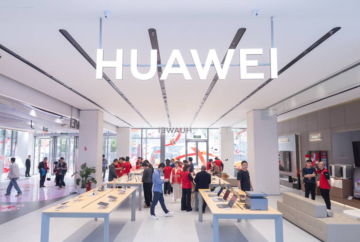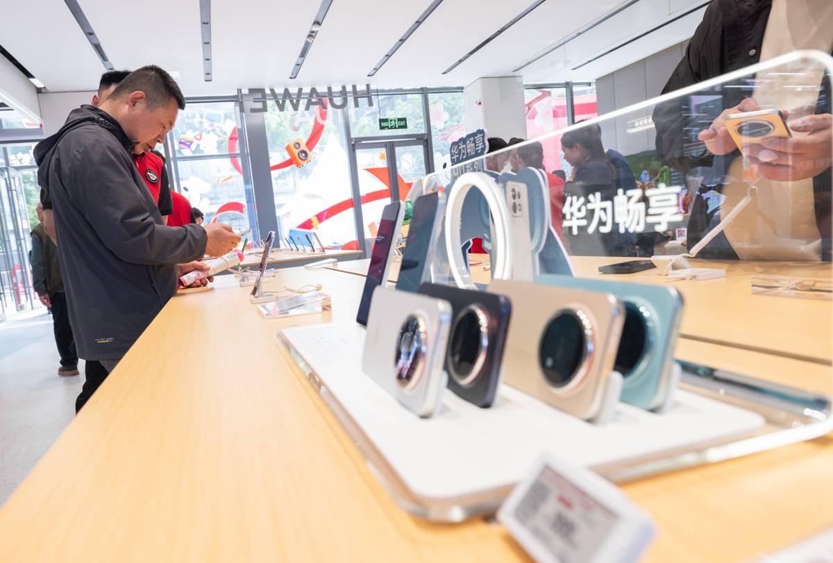 4月17日,顾客在京东mall武汉王家湾店挑选华为手机。(湖北日报全媒记者 柯皓 摄)