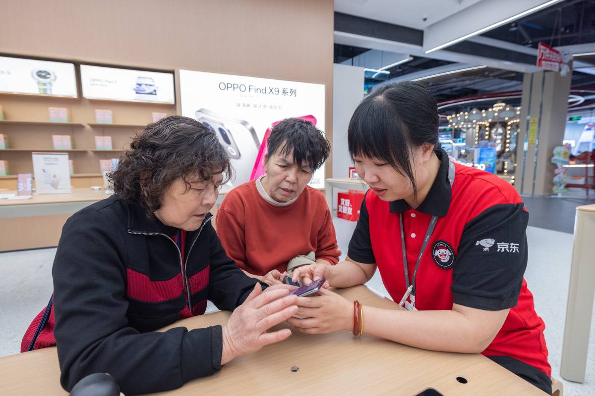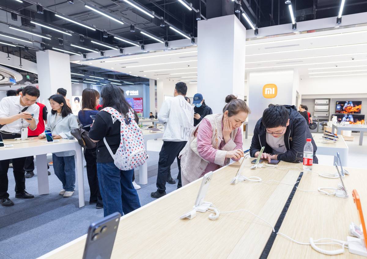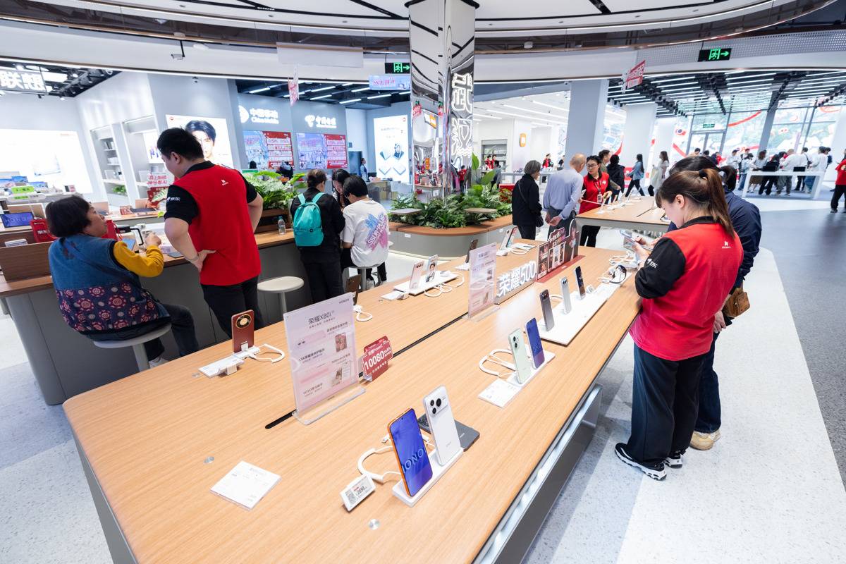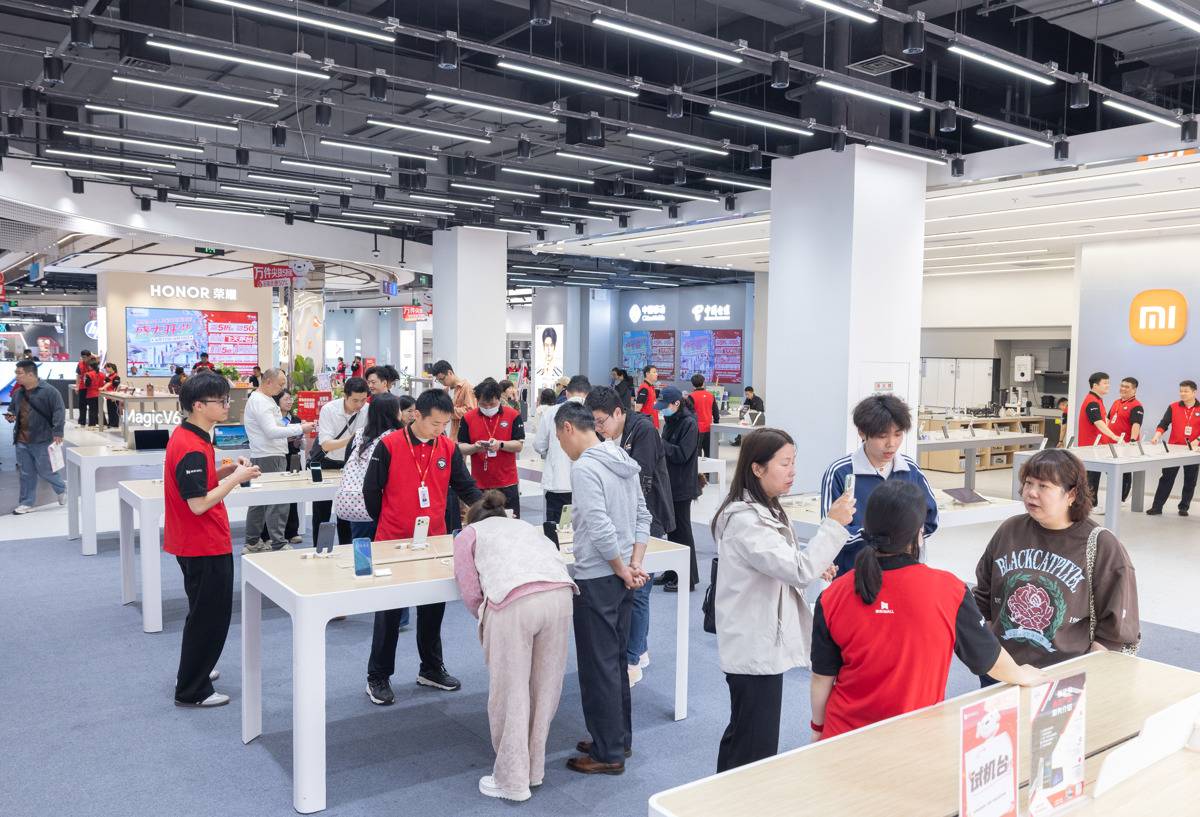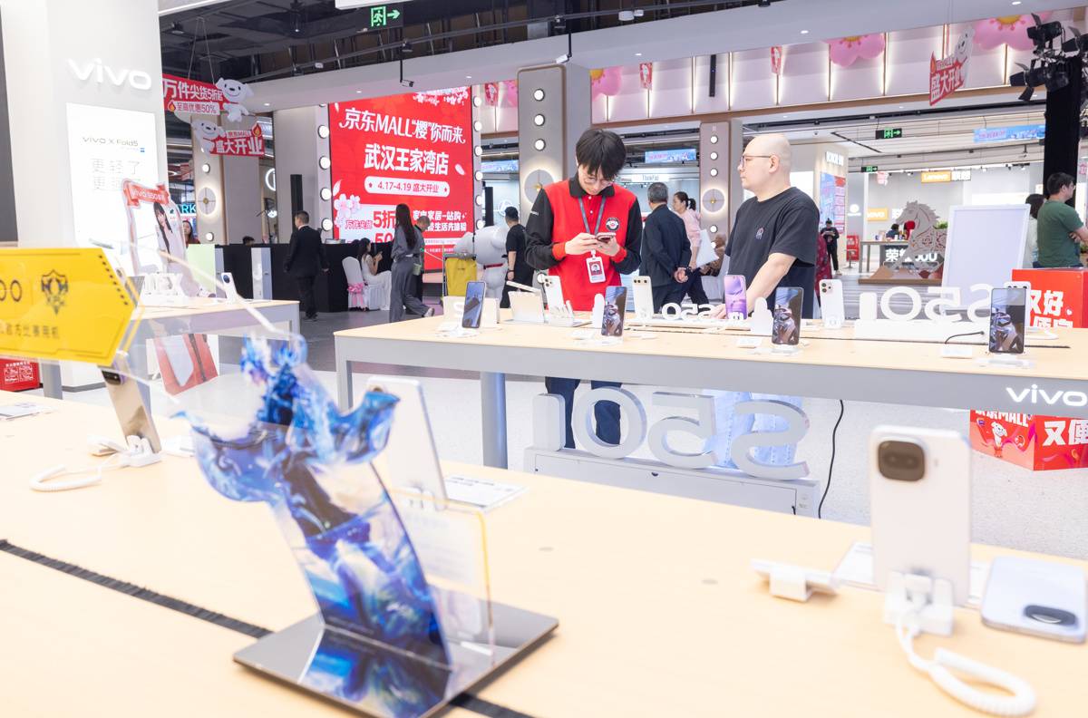 4月17日,顾客在京东mall武汉王家湾店挑选国产手机。(湖北日报全媒记者 柯皓 摄)