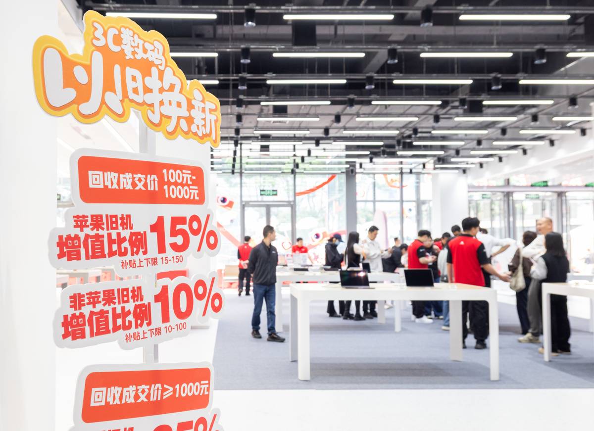 4月17日,京东mall武汉王家湾店内以旧换新的指示牌。(湖北日报全媒记者 柯皓 摄)