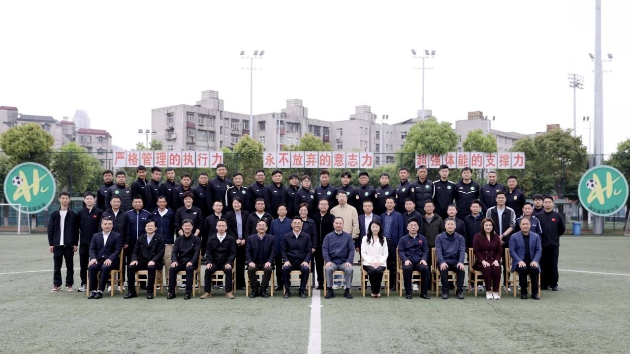 湖北省足球青训中心及分中心揭牌成立,全体人员合影。(图片来源:湖北体育)