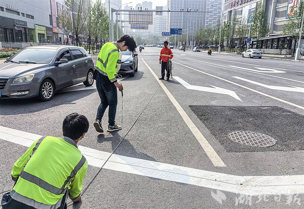 4月17日上午,3名施工人员正在武汉洪山区白沙三路上画线,近期,白沙三路全线通车。