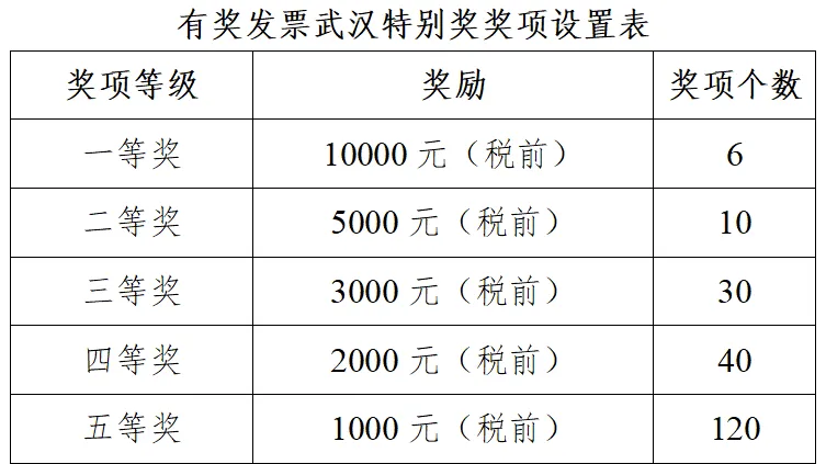 有奖发票武汉市第二期特别奖共设置一等奖6名、二等奖10名、三等奖30名、四等奖40名和五等奖120名,分别奖励税前10000元、5000元、3000元、2000元、1000元的无门槛消费券。