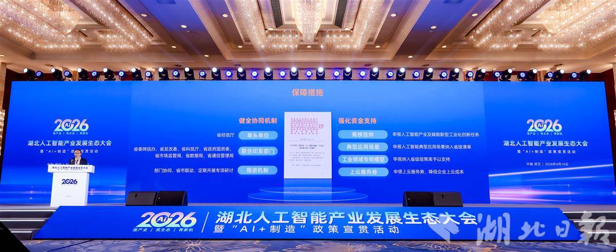 4月16日,作为“2026湖北人工智能产业发展生态大会暨‘AI+制造’政策宣贯活动”的核心环节之一,《湖北省“人工智能+制造”专项行动实施方案》(以下简称《实施方案》)政策解读在武汉洪山宾馆会议中心举行。湖北省经济和信息化厅党组成员、副厅长刘良博对《实施方案》进行了系统、权威的官方解读,明确了湖北推动人工智能与制造业深度融合的战略路径与阶段性目标。
