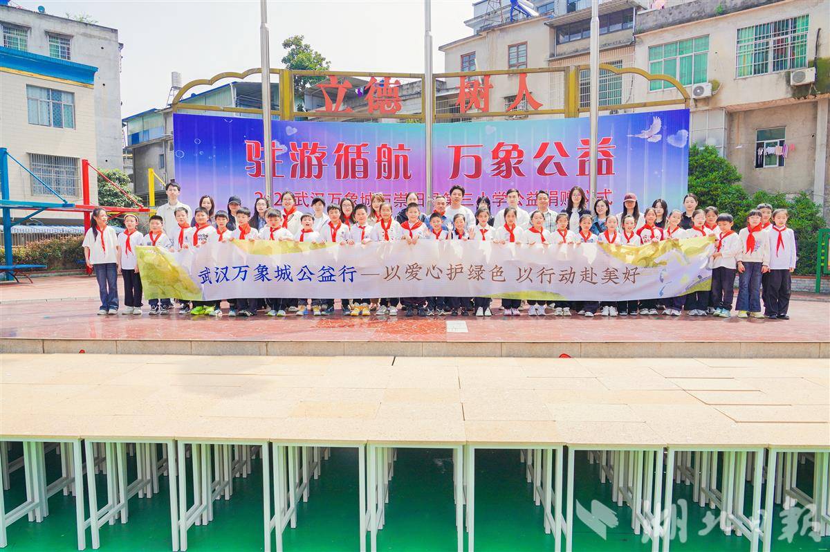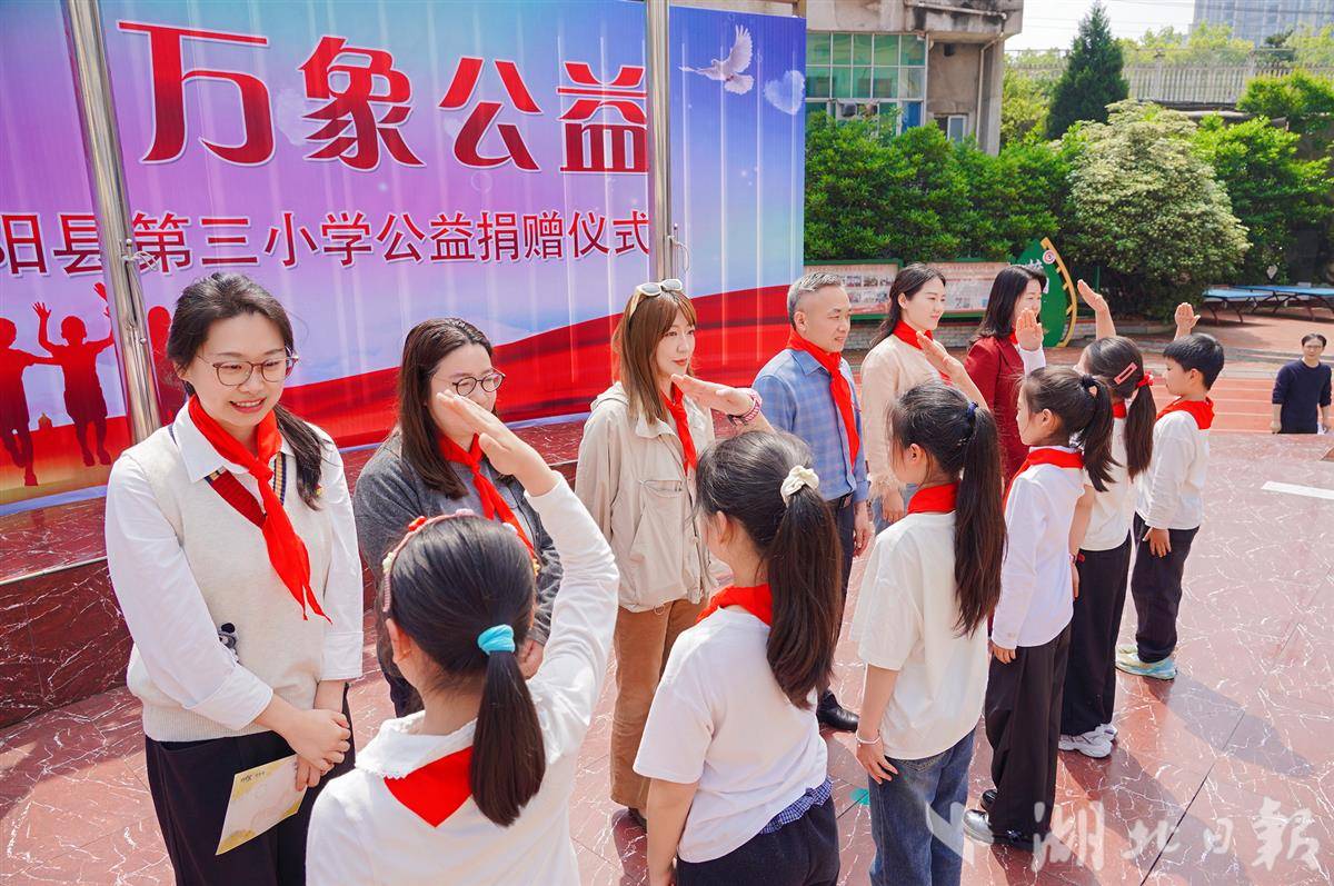 捐赠仪式上,崇阳县教育局团委方书记、崇阳三小曾校长、武汉万象城代表及台北街道代表等人共同出席。少先队员为嘉宾系上红领巾。简短的致辞后,双方互赠捐赠纪念牌。