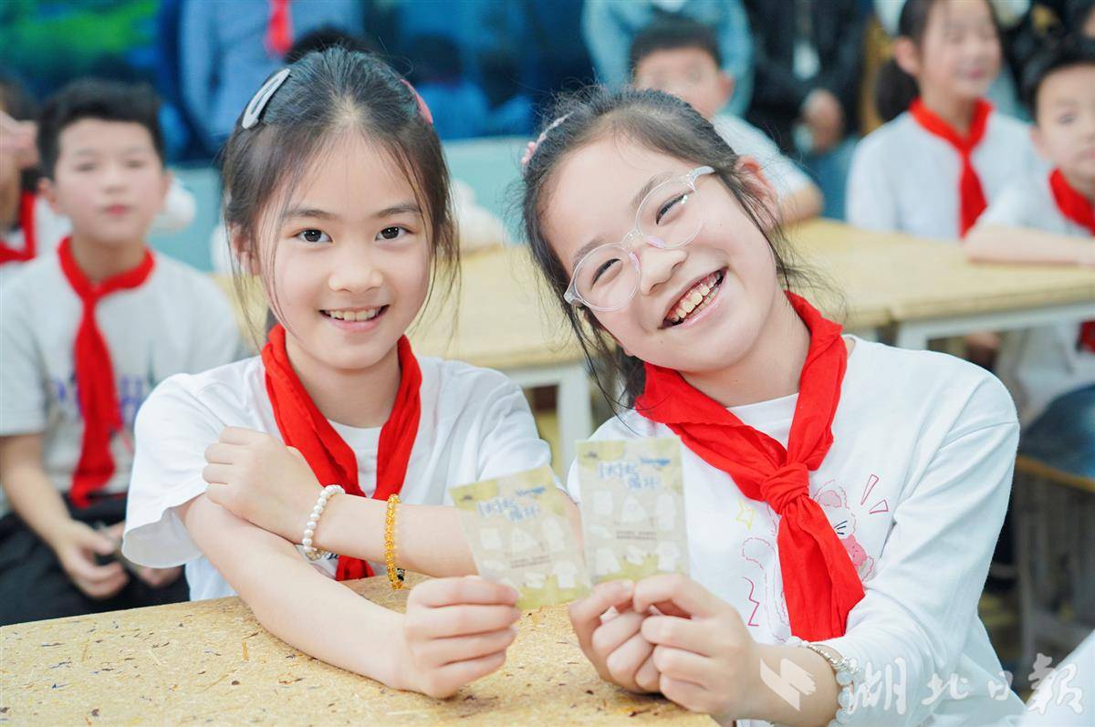 随后,一场特殊的环保课在五楼教室开讲。武汉万象城「Mixc Voyage驻游循航」可持续空间设计师向30余名学生展示了“花草板”的原材料样本,并播放了围挡回收再造的短片。孩子们围着课桌仔细观察,不时举手提问。有学生说:“原来我们用的桌子以前是商场的墙,好神奇。”