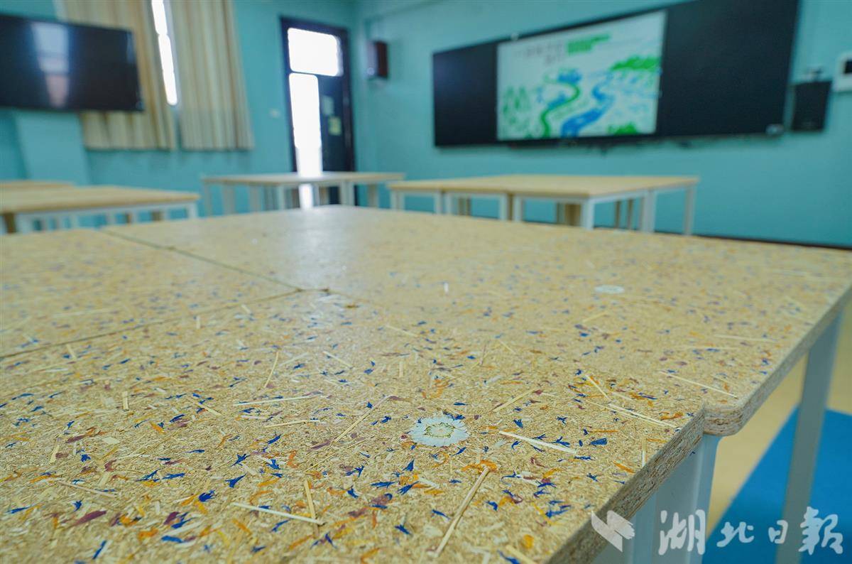 这些课桌的“前身”,是武汉万象城中庭的一块围挡。围挡由天然草本植物纤维、农林剩余物与环保基材复合而成的“花草板”制成,拆除后不产生建筑垃圾。经过工厂再造,它们变成了一套套安全耐磨的课桌,送到了学校。