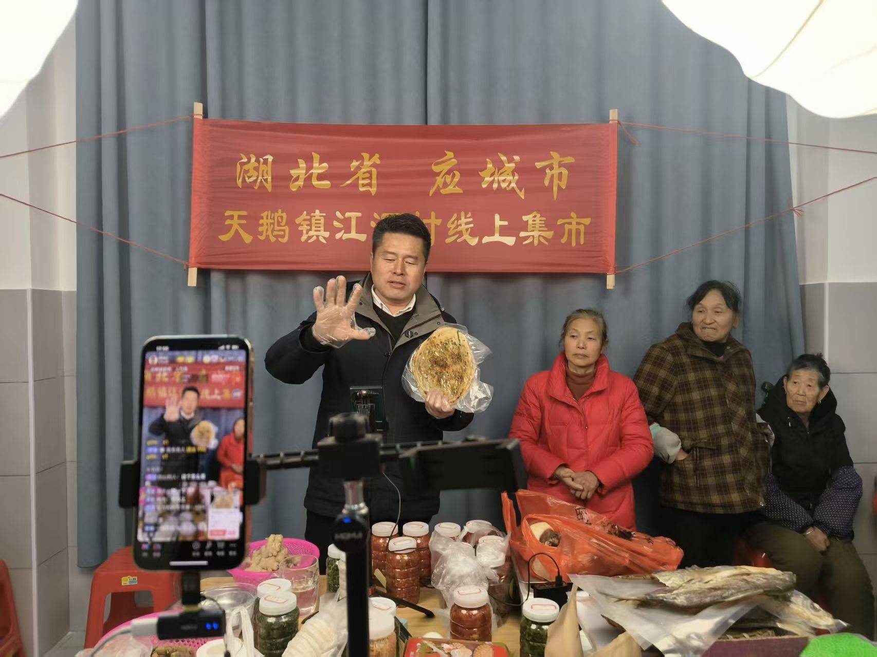简单的办公室内,一条印着“湖北省应城市天鹅镇江河村线上集市”的横幅、一张办公桌、一部手机、一盏补光灯,村干部们带着平均年龄超过75岁的“银发主播团”开播了。
