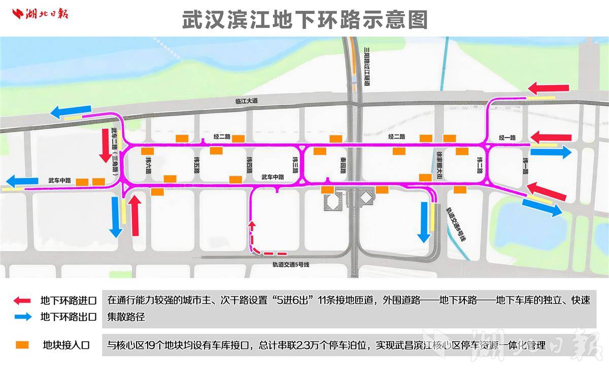 武昌滨江核心区楼宇林立,办公、商业密集度高,交通压力大。地下环路项目北至长江二桥,南抵绿地中心,东临和平大道,西靠临江大道,项目区域范围约138.64公顷。地下主线长3公里,匝道也是3公里,单向三车道,设计时速20公里,沿线设置11个接地出入口,还有“1进1出”连接长江公铁隧道。无论是从临江大道、徐家棚街,还是武车二路、武车中路,都能方便进出。