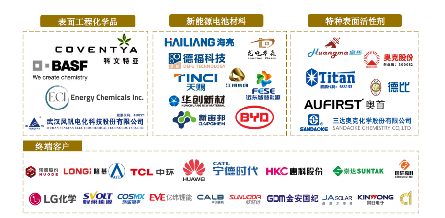 招股书显示,目前,公司已形成表面工程化学品、新能源电池材料和特种表面活性剂三大业务板块,产品应用于新能源汽车、PCB表面处理、铜箔电镀、金刚线切割多晶硅片、隔膜材料涂覆等多个领域,并与新宙邦、珠海赛纬、巴斯夫等新能源电解液、锂电铜箔等领域头部企业建立稳定合作关系。根据中国表面工程协会调研统计,吉和昌的镀镍、镀锌等电镀中间体产品销售规模国内排名前五,市场占有率超过10%。另外,公司锂电铜箔添加剂销售规模国内排名第一,市场占有率超过40%。