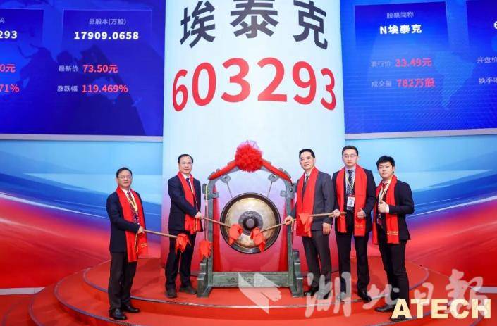 湖北日报讯(记者肖丽琼、通讯员杨洋)4月16日,长江产业集团旗下长江产投公司所投企业——芜湖埃泰克汽车电子股份有限公司(以下简称“埃泰克”),在上海证券交易所主板挂牌上市,股票代码为603293。本次发行共募集资金约14.99亿元,将主要用于智能汽车电子技术研发、生产基地建设与供应链能力提升,标志着企业在汽车电子智能化、自主化发展道路上迈入全新发展阶段。