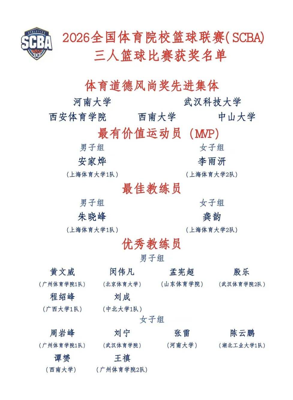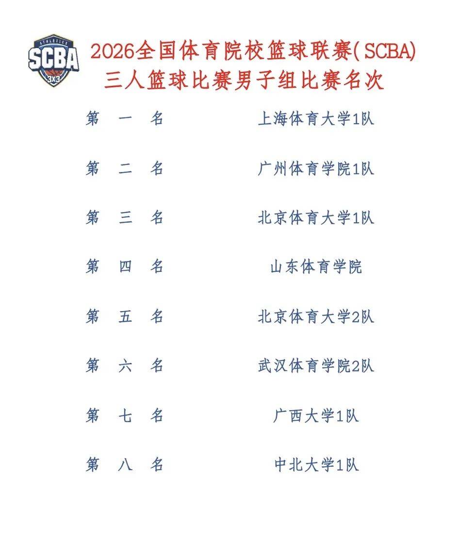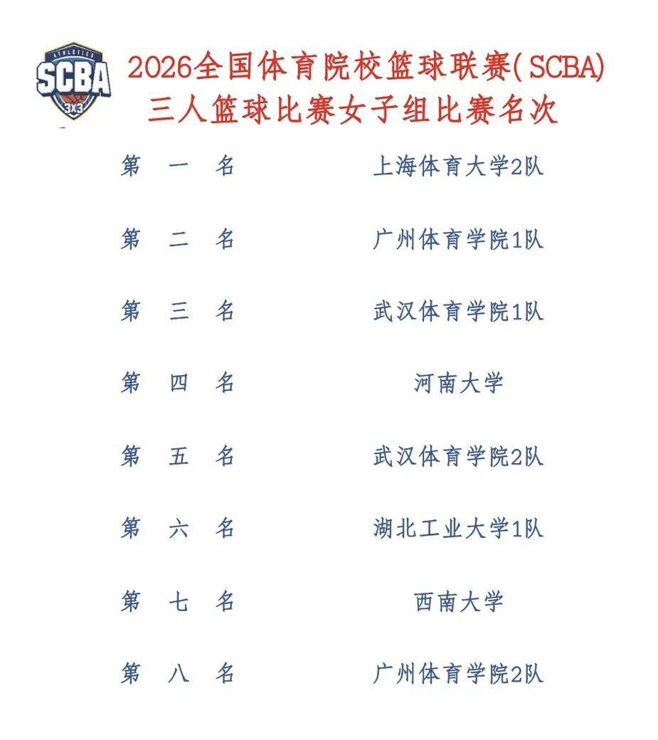 4月17日晚,经过为期4天140场比赛的激烈角逐,2026全国体育院校篮球联赛(SCBA)三人篮球比赛在湖北襄阳奥林匹克体育中心落下帷幕。最终,上海体育大学男篮1队、女篮2队包揽首届三人男女篮冠军,广州体育学院男篮1队、女篮1队获得男女篮亚军,北京体育大学男篮1队、武汉体育学院女篮1队分别获得男女篮季军。
