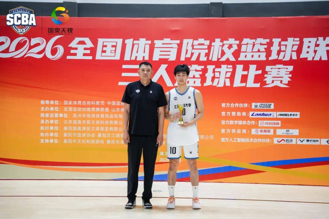 杨成、刘敏共同为男子组冠军上海体育大学男篮1队颁奖。