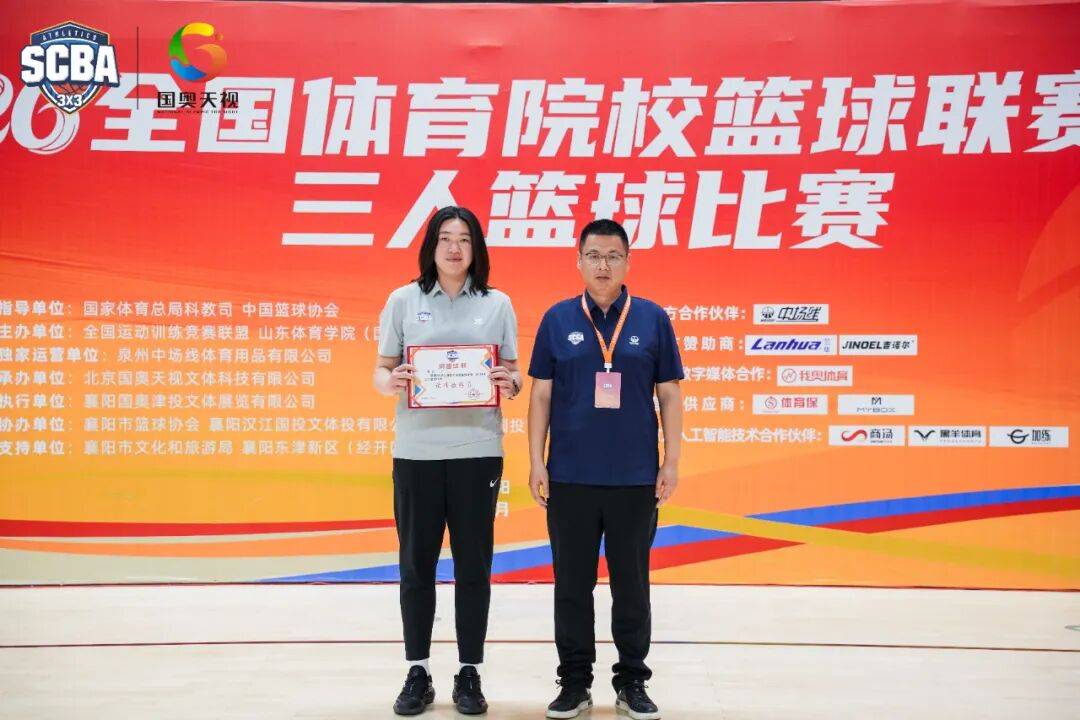 杨成、孔昂共同为女子组冠军上海体育大学女篮2队颁奖。