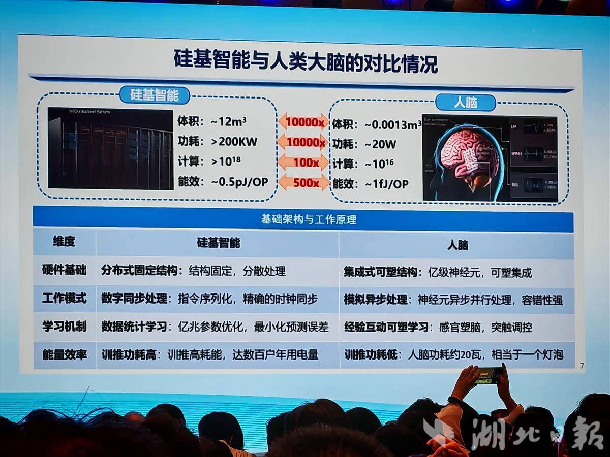 郑海荣最后抛出了一个更超前的概念:生物计算机。他展示了一张大脑与硅基芯片的对比图:人脑只有0.0013立方米,功耗仅20瓦,相当于一个灯泡,却能完成情感、决策、创造等复杂任务;而一台超级计算机体积是人脑的一万倍,功耗超过20万瓦,却依然没有人的智慧。如何能让硅基智能达到碳基智能的效率呢?他引用《自然》期刊2025年的论文,表明