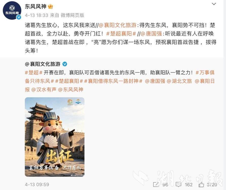 昨天襄阳对阵仙桃的比赛上,东风风神“偷师”丞相,联合襄阳文旅玩了一手漂亮的“借东风”,就连诸葛亮扮演者唐国强老师本人都接梗了,好不热闹。
