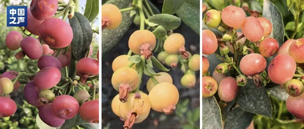 大连大学蓝莓生物育种团队培育的“红玛瑙”蓝莓(左)、“锦程”蓝莓(中)、“红水晶”蓝莓(右)