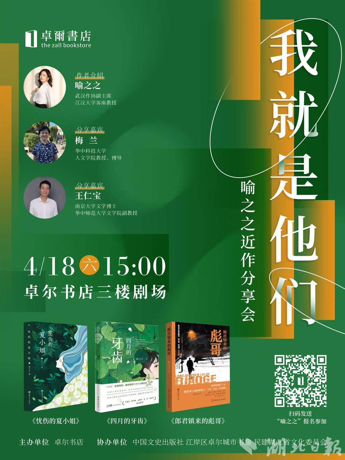 湖北日报讯(记者农新瑜、通讯员王宁)4月18日,“我就是他们——喻之之近作分享会”在位于武汉汉口的卓尔书店举行。知名作家、武汉作协副主席喻之之携新近出版的小说集《郎君镇来的彪哥》《四月的牙齿》《忧伤的夏小姐》与读者见面,并与华中科技大学教授梅兰、华中师范大学文学院副教授王仁宝进行对谈,为现场读者展开了一场精彩的文学分享。