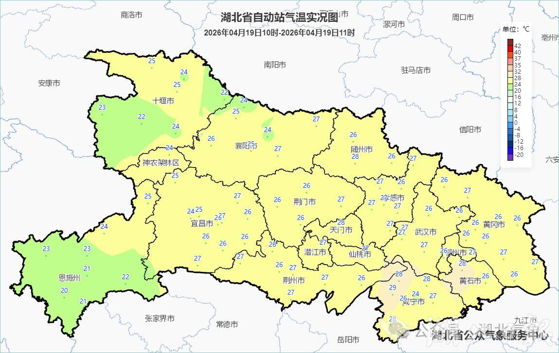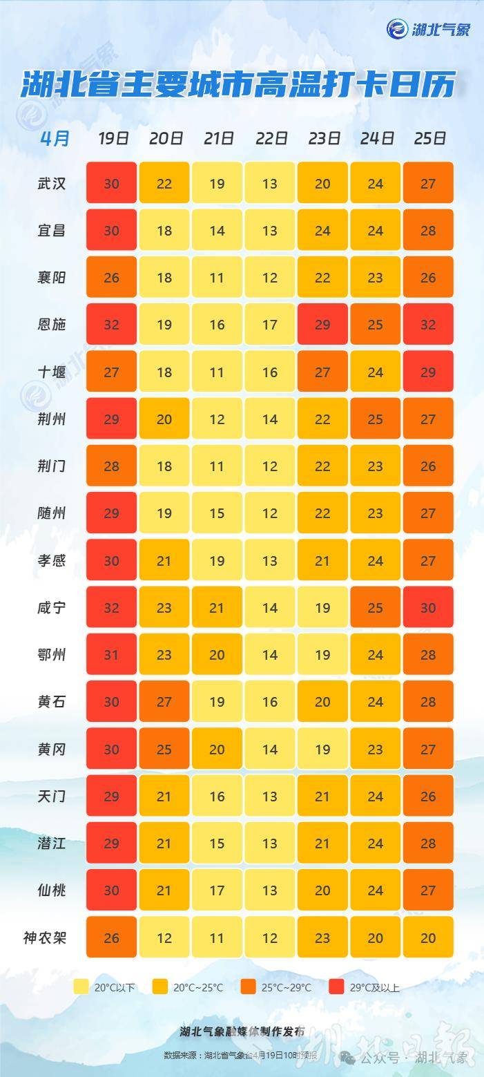 湖北日报讯(记者曾莉)4月19日上午,湖北多地天气晴好,但荆州、潜江、黄石、黄冈等地的14个乡镇早晨出现局地浓雾。午后鄂西北地区最高气温可达25至28℃,其他地区升至29至33℃。不过,这份“初夏体验卡”即将到期,天气正在酝酿大转折。据省气象台最新消息,受冷空气影响,预计从今天(19日)下午至22日白天,湖北自西向东将迎来一次明显的降雨、降温和大风天气过程,最高气温将上演“满30减15”的剧烈下滑。