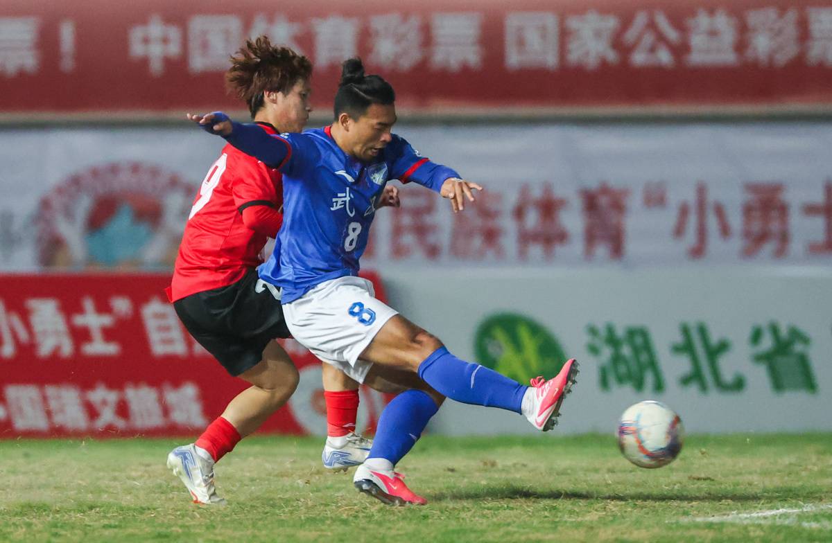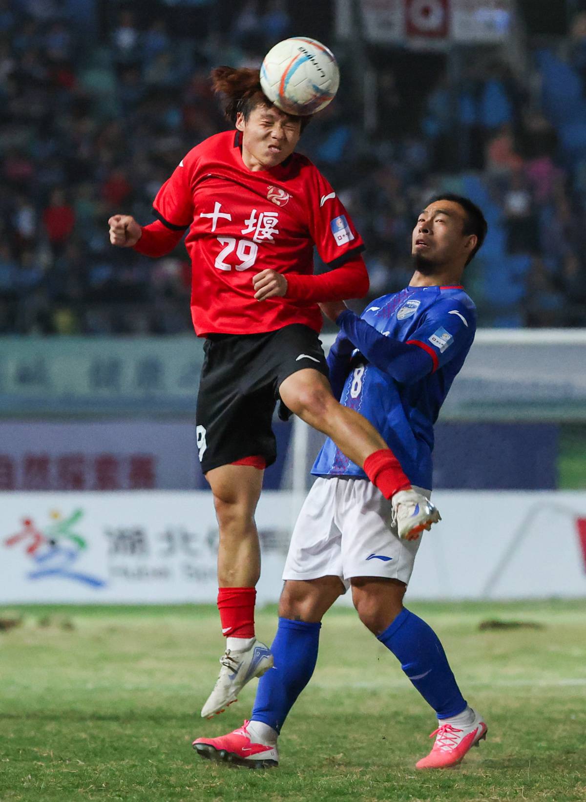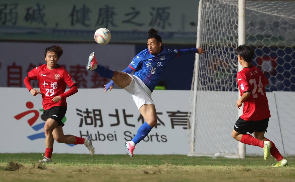 4月19日,武汉队8号阎新禹(右)射门。本次比赛他打进2粒入球。(湖北日报全媒记者 柯皓 摄)