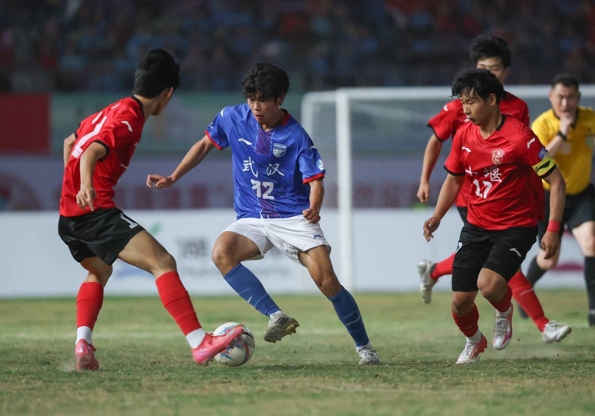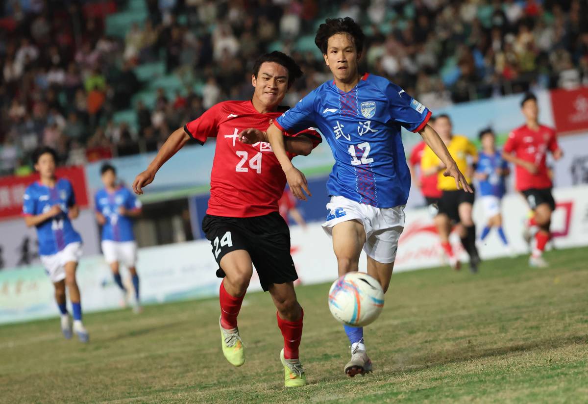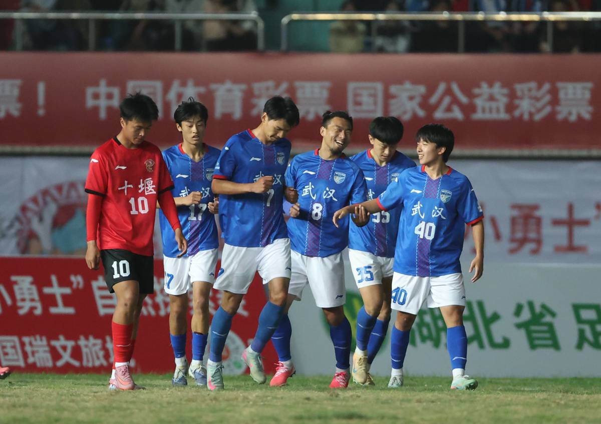 4月19日,武汉队8号阎新禹(右2)打进2粒入球。(湖北日报全媒记者 柯皓 摄)