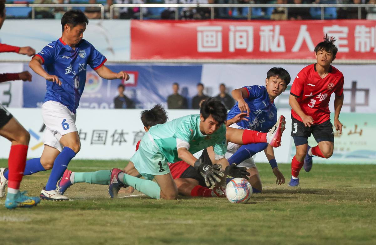 4月19日,十堰队守门员没收皮球。(湖北日报全媒记者 柯皓 摄)