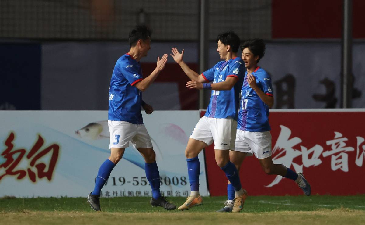 4月19日,武汉队8号阎新禹(中)打进2粒入球。(湖北日报全媒记者 柯皓 摄)