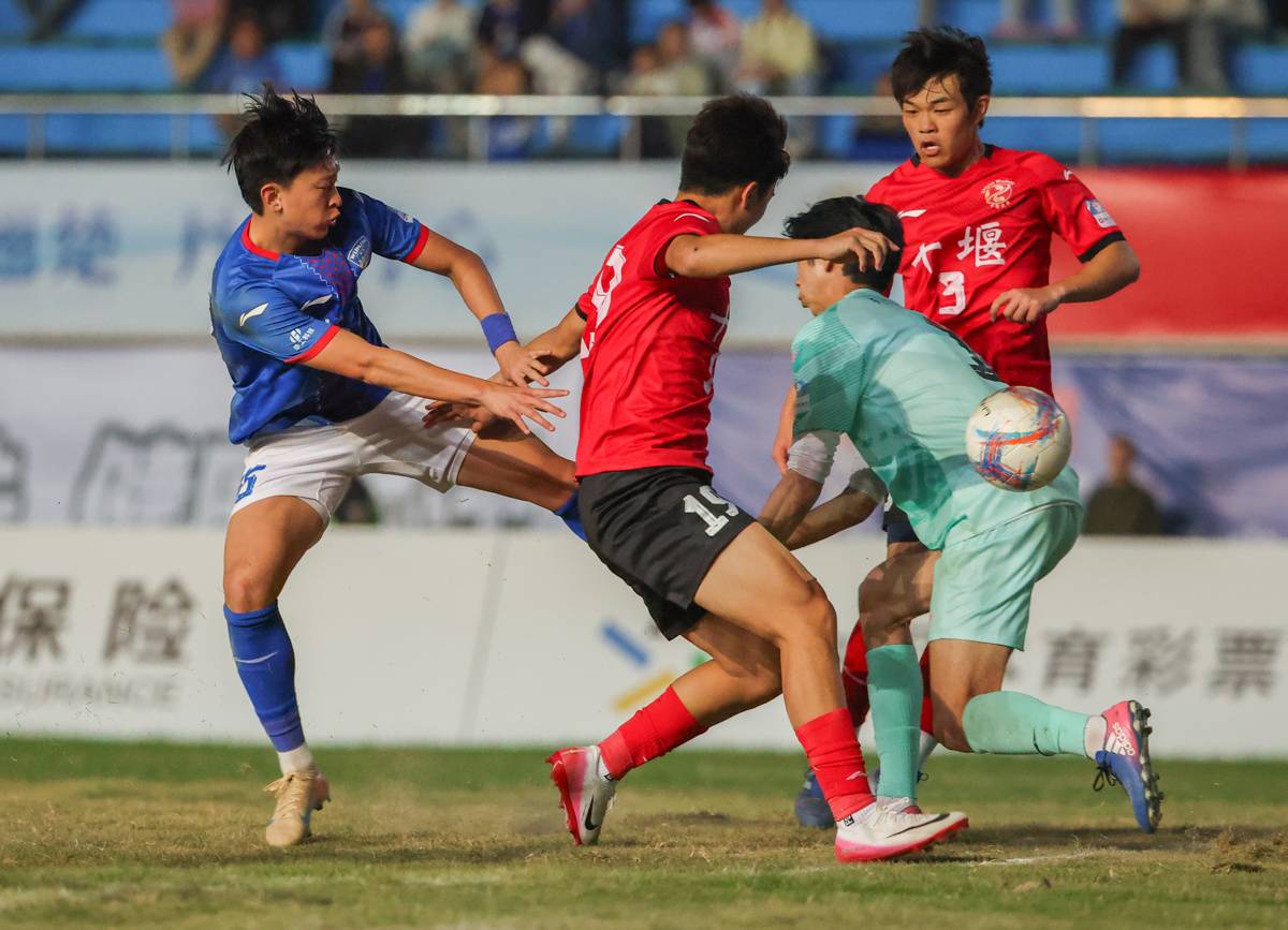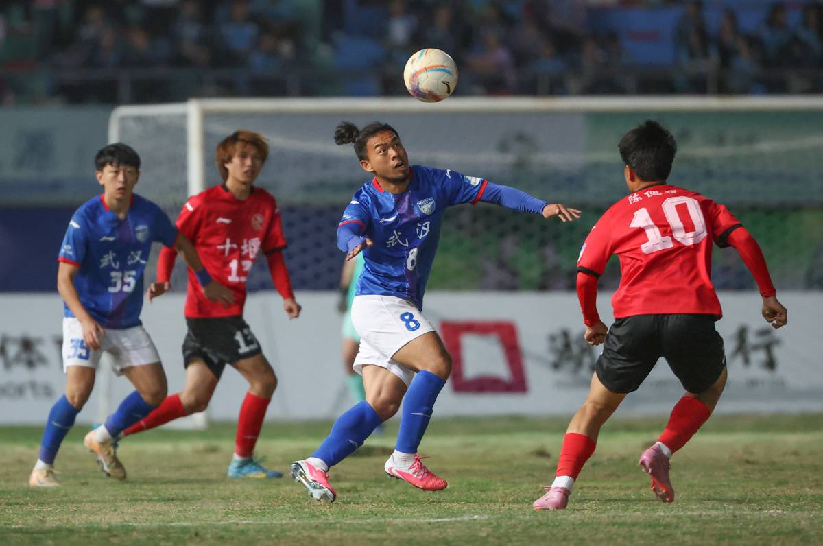 4月19日,武汉队35号姚子扬(左1)进球瞬间。他打进了楚超武汉队的第一粒进球。(湖北日报全媒记者 柯皓 摄)