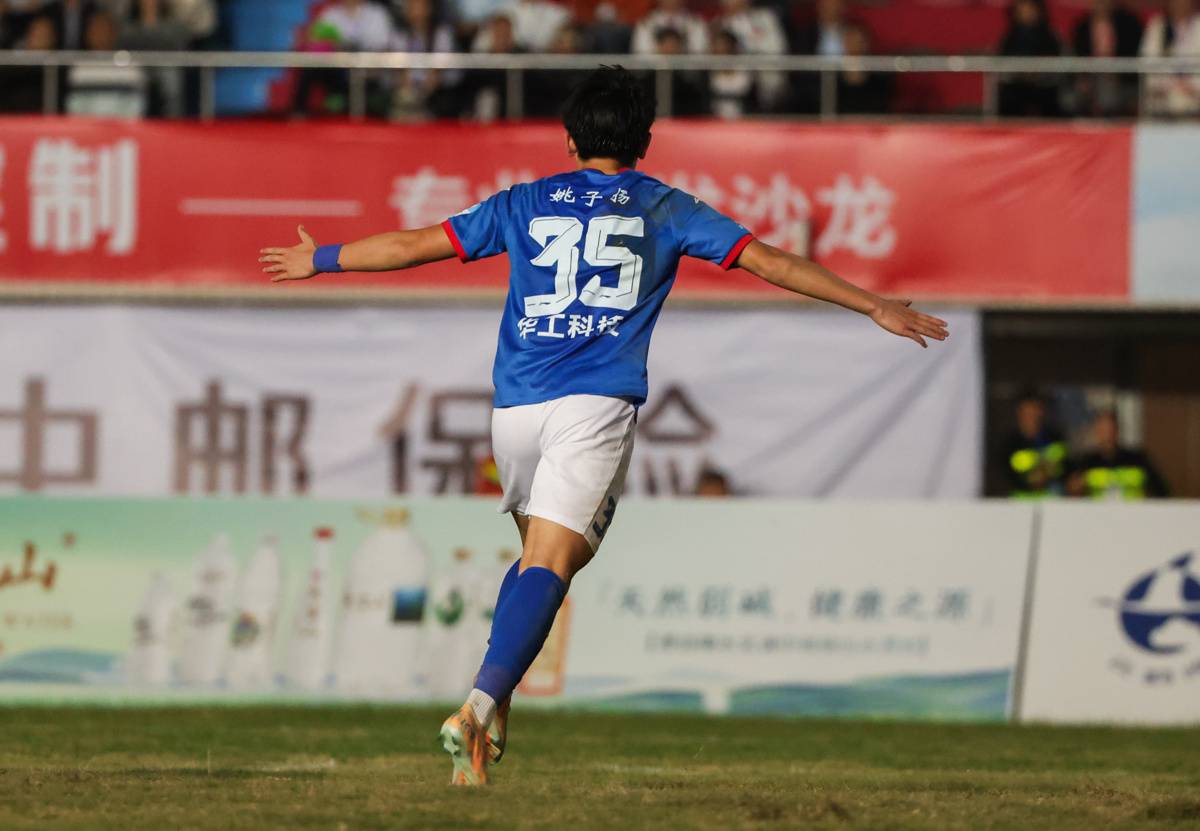4月19日,武汉队35号姚子扬庆祝进球。他打进了楚超武汉队的第一粒进球。(湖北日报全媒记者 柯皓 摄)