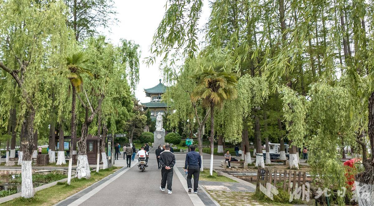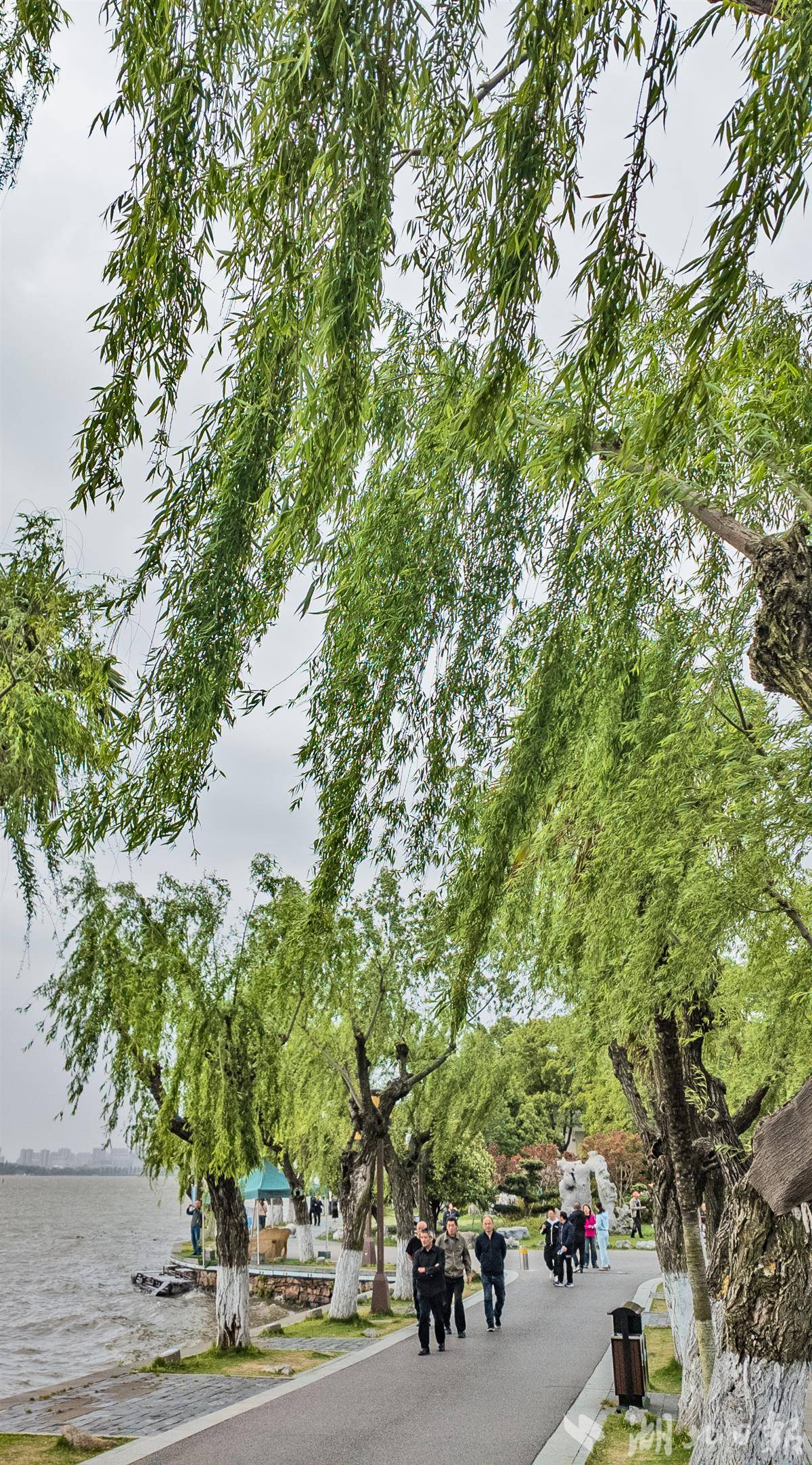 湖面受风力影响碧波起伏,环湖堤岸的垂柳被风吹得漫天飘摇、舒展舞动,勾勒出别样的春日景致。尽管风势不小,但并未阻挡市民游客的踏青热情。