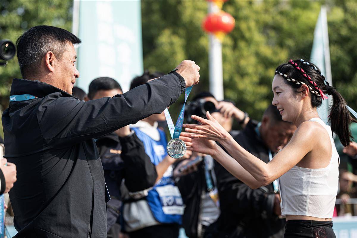 3月29日上午,体操世界冠军李大双为仙桃马拉松女子半马冠军尹婷挂上奖牌。(湖北日报全媒记者 任勇 摄)