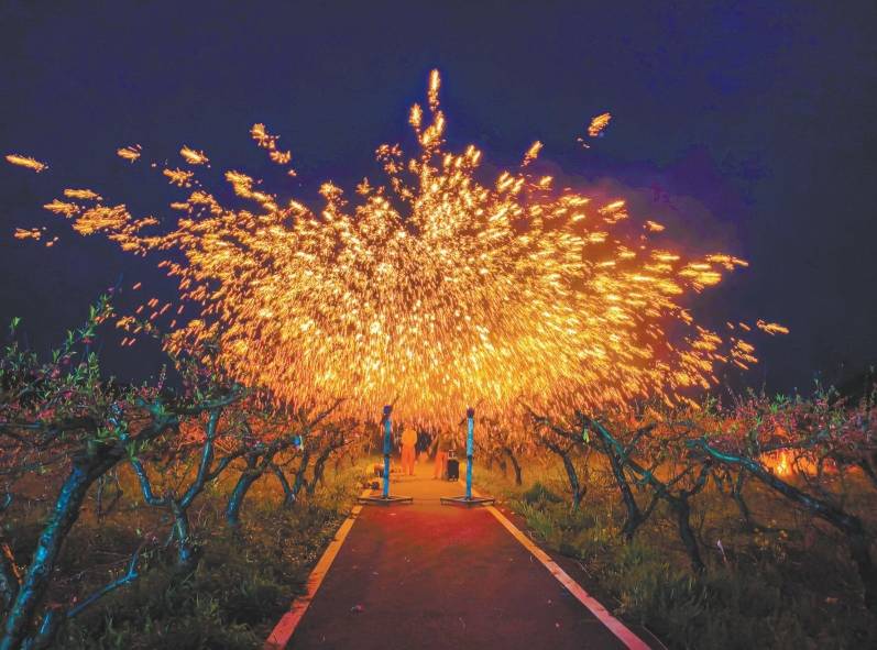 夜幕降临,剅河则换上了另一副面孔。1600℃的铁水被击打至高空,瞬间迸发出万朵金色火花——非遗打铁花在夜空中绽放出漫天花雨,照亮整片桃林上空。风火轮旋转着金色光弧,烟花瀑布从高处倾泻而下,流光溢彩。