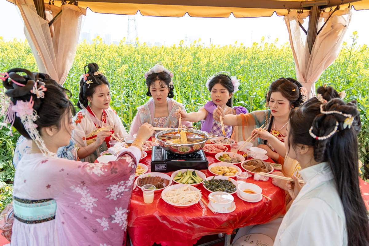 游客在油菜花田品尝“火锅宴”。通讯员 郑恒 摄